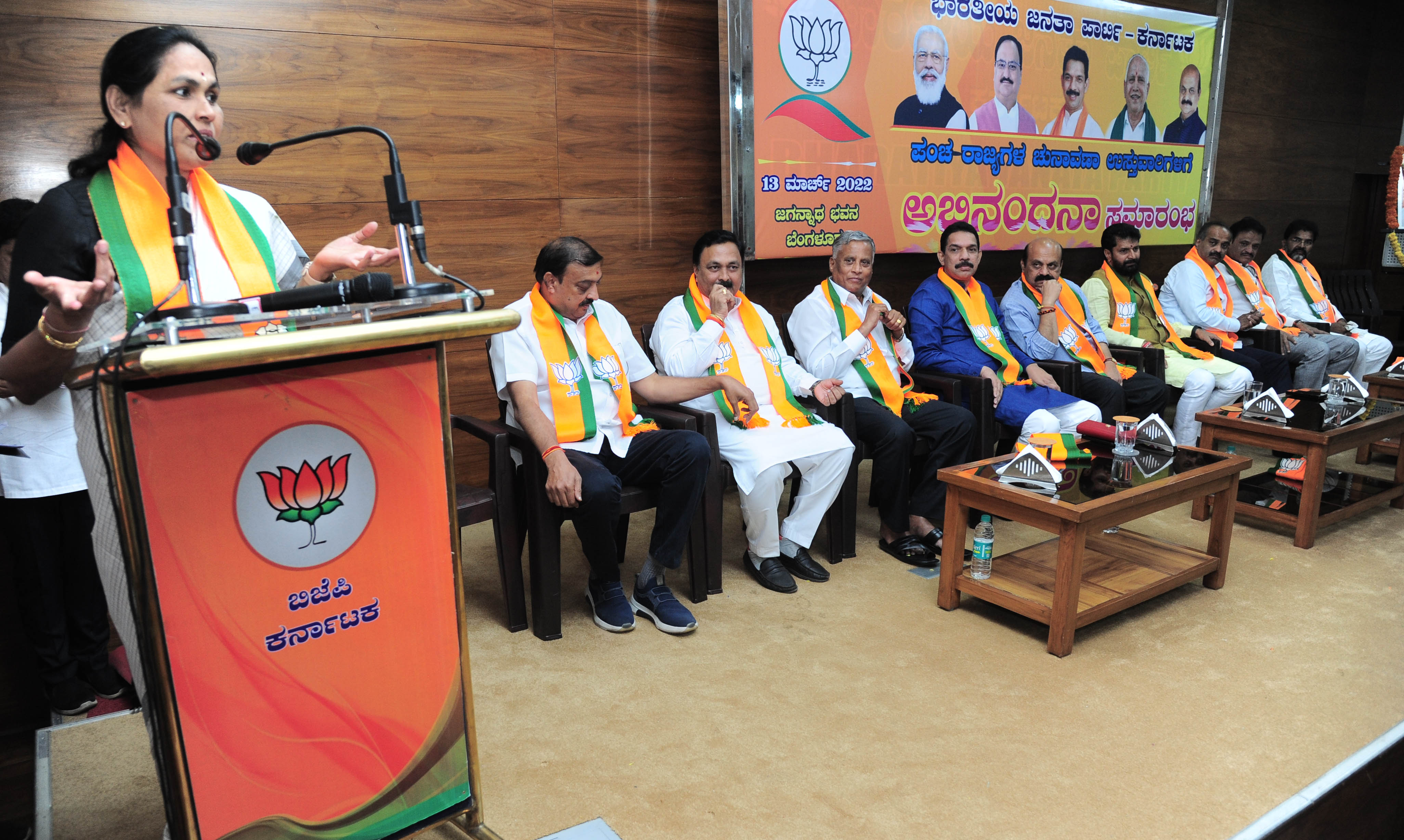 ಪಂಚರಾಜ್ಯ ಚುನಾವಣೆಯಲ್ಲಿ ಉಸ್ತುವಾರಿಗಳಾಗಿ ಜವಾಬ್ದಾರಿ ವಹಿಸಿದ ಕೇಂದ್ರ ಸಚಿವ ಪ್ರಲ್ಹಾದ್ ಜೋಶಿ, ಬಿಜೆಪಿ ರಾಷ್ಟ್ರೀಯ ಪ್ರಧಾನ ಕಾರ್ಯದರ್ಶಿ ಸಿ.ಟಿ. ರವಿ ಮತ್ತು ಕೇಂದ್ರ ಸಚಿವೆ ಶೋಭಾ ಕರಂದ್ಲಾಜೆ ಅವರಿಗೆ ರವಿವಾರ ಮಲ್ಲೇಶ್ವರಂನ ಬಿಜೆಪಿ ಕಚೇರಿಯಲ್ಲಿ ಏರ್ಪಡಿಸಿದ್ದ ಅಭಿನಂದನಾ ಕಾರ್ಯಕ್ರಮದಲ್ಲಿ ಅವರು ಮಾತನಾಡಿದರು. ಒಗ್ಗಟ್ಟಿನ ಮಂತ್ರ, ಶ್ರಮದಿಂದ ರಾಜ್ಯದಲ್ಲೂ 24 ಗಂಟೆ ನಿರಂತರ ದುಡಿದು ಬಿಜೆಪಿಗೆ ಗೆಲುವು ಸಿಗಬೇಕಿದೆ. ಯೋಜನಾಬದ್ಧ ಚುನಾವಣೆ ಮಾಡೋಣ. ಒಟ್ಟಾಗಿ ನಿಲ್ಲೋಣ. ಒಂದುಗೂಡಿ ಗೆಲುವು ತರೋಣ ಎಂದರು.