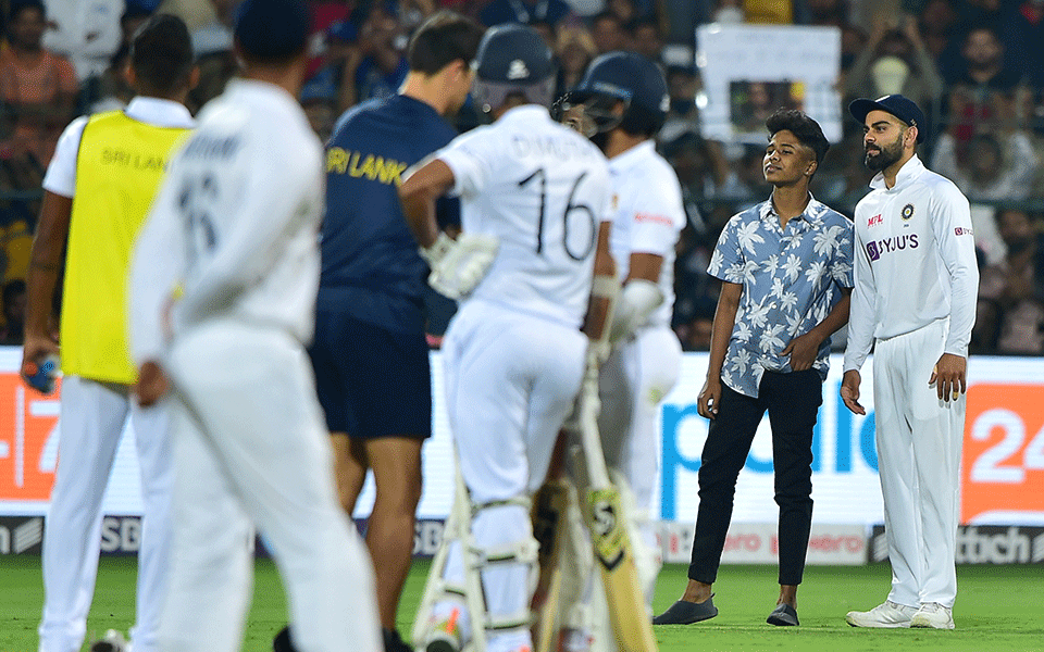 ಬೆಂಗಳೂರು: ಉದ್ಯಾನನಗರಿ ಬೆಂಗಳೂರಿನಲ್ಲಿ ನಡೆಯುತ್ತಿರುವ ಭಾರತ ಹಾಗೂ ಶ್ರೀಲಂಕಾ ನಡುವಿನ ಟೆಸ್ಟ್ ಪಂದ್ಯವು ಸಣ್ಣದೊಂದು ಭದ್ರತಾ ಉಲ್ಲಂಘನೆಗೆ ಸಾಕ್ಷಿಯಾಯಿತು. ಮೂವರು ಕ್ರಿಕೆಟ್ ಅಭಿಮಾನಿಗಳು ರವಿವಾರ 2 ನೇ ದಿನದ ಮುಕ್ತಾಯದ ಹಂತಕ್ಕೆ ಮೈದಾನದೊಳಗೆ ನುಸುಳಿದ ಘಟನೆ ನಡೆದಿದೆ.