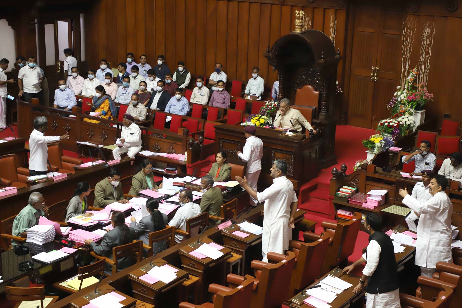 ಕಾಂಗ್ರೆಸ್ ಹಾಗೂ ಬಿಜೆಪಿ ಸದಸ್ಯರ ನಡುವೆ ಗದ್ದಲ ಉಂಟಾಗಿದ್ದು, ನಂತರ ಕಾಂಗ್ರೆಸ್ ಸದಸ್ಯರು ಸದನದಲ್ಲಿ ಮಾಡಿದ ಘೋಷಣೆ ವಾಪಸ್ ಪಡೆಯಬೇಕು ಎಂದು ಪರಿಷತ್ ಬಾವಿಗಿಳಿದು ಧರಣಿ ನಡೆಸಿದರು.