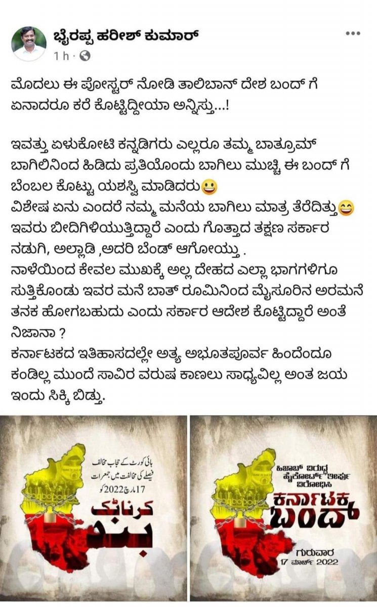 ಬೆಂಗಳೂರು: ಕರ್ನಾಟಕ ರಣಧೀರ ಪಡೆ ರಾಜ್ಯಾಧ್ಯಕ್ಷ ಭೈರಪ್ಪ ಹರೀಶ್ ಕುಮಾರ್ ರವರು ಪೋಸ್ಟ್ ಮಾಡಿದ್ದರೆನ್ನಲಾದ ಫೇಸ್ ಬುಕ್ ಪೋಸ್ಟ್ ನ ಚಿತ್ರವೊಂದು ಸಾಮಾಜಿಕ ತಾಣದಾದ್ಯಂತ ವಿವಾದ ಸೃಷ್ಟಿಸಿದೆ. ಹಿಜಾಬ್ ಪ್ರಕರಣದಲ್ಲಿ ಹೈಕೋರ್ಟ್ ತೀರ್ಪಿಗೆ ಅಸಮಾಧಾನ ವ್ಯಕ್ತಪಡಿಸಿ ಮುಸ್ಲಿಂ ಧರ್ಮೀಯರು ನೀಡಿದ್ದ ಬಂದ್ ಕರೆಯನ್ನು ವಿರೋಧಿಸಿ ಹರೀಶ್ ಕುಮಾರ್ ಲೈವ್ ವೀಡಿಯೋ ಮಾಡಿದ್ದ ಬೆನ್ನಿಗೇ ಈ ಸ್ಕ್ರೀನ್ ಶಾಟ್ ವೈರಲ್ ಆಗಿದೆ. "ಮೊದಲು ಈ ಪೋಸ್ಟರ್ ನೋಡಿ ತಾಲಿಬಾನ್ ದೇಶ ಬಂದ್ ಗೆ ಏನಾದರೂ ಕರೆ ಕೊಟ್ಟಿದ್ದೀಯಾ ಅನ್ನಿಸ್ತು" ಎಂಬ ತಲೆಬರಹದ ಅವರದ್ದೆನ್ನಲಾದ ಪೋಸ್ಟ್ ವೈರಲ್ ಆಗಿದೆ.