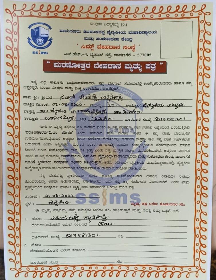 ದಾವಣಗೆರೆ: ಉಕ್ರೇನ್ ನಲ್ಲಿ ಮೃತಪಟ್ಟ ನವೀನ್ ಮೃತದೇಹ ಮೆಡಿಕಲ್ ಕಾಲೇಜಿಗೆ ಹಸ್ತಾಂತರ