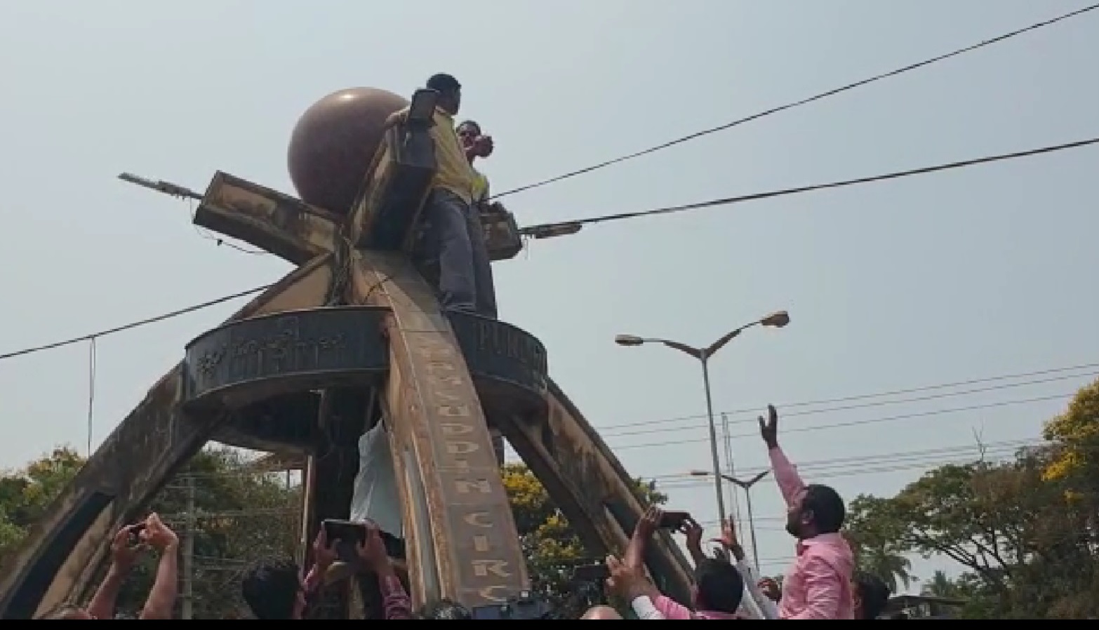 ಭಟ್ಕಳ, ಮಾ.23: ಭಟ್ಕಳದಲ್ಲಿ ಮೊಗೇರ ಸಮಾಜ ನಡೆಸಿದ ಪ್ರತಿಭಟನಾ ಮೆರವಣಿಗೆಯ ವೇಳೆ ವ್ಯಕ್ತಿಯೋರ್ವ ಶಂಸುದ್ದೀನ್ ವೃತ್ತದ ಗೋಪುರವನ್ನೇರಿ ವಿಷ ಸೇವಿಸಲು ಯತ್ನಿಸಿದ ಘಟನೆ ಇಂದು ಬೆಳಗ್ಗೆ ನಡೆದಿದೆ.