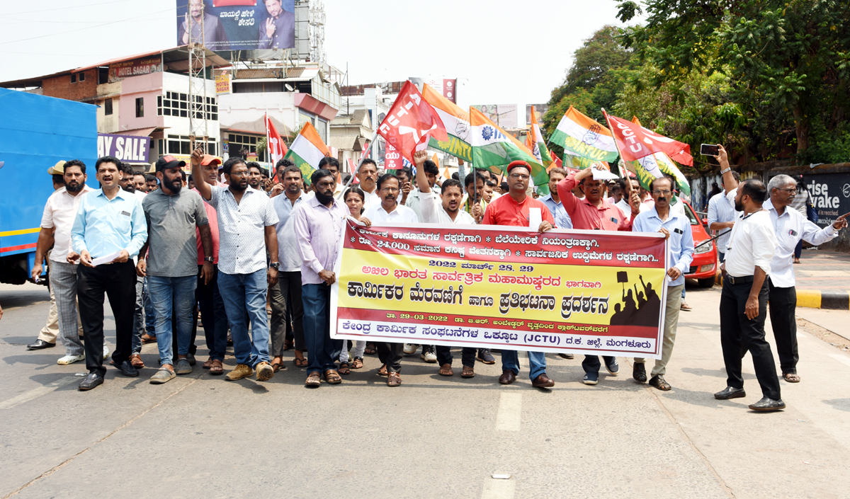ಮಂಗಳೂರು, ಮಾ.29: ಕಾರ್ಮಿಕ ವರ್ಗದ ಹಲವಾರು ಬೇಡಿಕೆಗಳನ್ನು ಮುಂದಿಟ್ಟು ಕೇಂದ್ರ ಕಾರ್ಮಿಕ ಸಂಘಟನೆಗಳು ಕರೆ ನೀಡಿದ್ದ ಅಖಿಲ ಭಾರತ ಮಹಾಮುಷ್ಕರದ ಅಂಗವಾಗಿ ಇಂದು ಮಂಗಳೂರಿನಲ್ಲಿ ಕಾರ್ಮಿಕರ ಮೆರವಣಿಗೆ ಹಾಗೂ ಪ್ರತಿಭಟನಾ ಪ್ರದರ್ಶನ ನಡೆಯಿತು.
