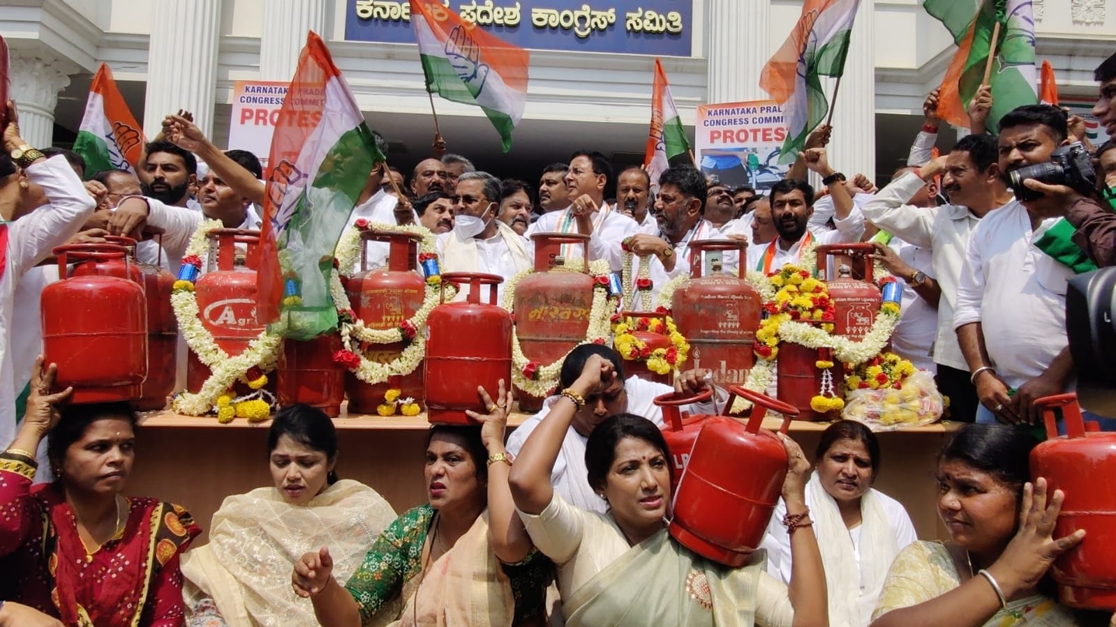 ಬೆಂಗಳೂರು: ಪೆಟ್ರೋಲ್, ಡಿಸೇಲ್, ಅಡುಗೆ ಅನಿಲ ಬೆಲೆ ಏರಿಕೆ ಖಂಡಿಸಿ ಕಾಂಗ್ರೆಸ್ ಪ್ರತಿಭಟನೆ
