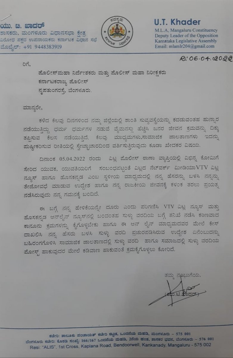 ದ.ಕ.ಜಿಲ್ಲೆಯಲ್ಲಿ ಇತ್ತೀಚಿನ ದಿನಗಳಲ್ಲಿ ಶಾಂತಿ ಕದಡುವ ಉದ್ದೇಶದಿಂದ ಕೆಲವು ಶಕ್ತಿಗಳು ಧರ್ಮಗಳ ಮಧ್ಯೆ ವೈಮನಸ್ಸು ಹುಟ್ಟು ಹಾಕುವ ಕೆಲಸ ಮಾಡುತ್ತಿವೆ. ಅದಕ್ಕೆ ಕೆಲವು ಮಾಧ್ಯಮಗಳು ಮತ್ತು ಸಾಮಾಜಿಕ ಜಾಲತಾಣಗಳಲ್ಲಿ ಪುಷ್ಠೀಕರಿಸುವ ಕೆಲಸವೂ ನಡೆಯುತ್ತಿದೆ. ಎ.5ರಂದು ವಿಟ್ಲದಲ್ಲಿ ಪತ್ತೆಯಾದ ವಿಭಿನ್ನ ಜೋಡಿ ಪ್ರಕರಣಕ್ಕೆ ಸಂಬಂಧಿಸಿದಂತೆ ವಿಟ್ಲದ ನೆಟ್ವರ್ಕ್ ಮೀಡಿಯಾ ವಿಟಿವಿ ನ್ಯೂಸ್ ಮತ್ತು ಹೊಸಕನ್ನಡ ಎಂಬ ಸುದ್ದಿ ಮಾಧ್ಯಮಗಳಲ್ಲಿ ನನ್ನ ಹೆಸರಿಗೆ ಕಳಂಕ ತರುವ ಪ್ರಯತ್ನ ನಡೆದಿದೆ. ಹಾಗಾಗಿ ಈ ಬಗ್ಗೆ ಸೂಕ್ತ ತನಿಖೆ ನಡೆಸಿ ಕಾನೂನು ಕ್ರಮ ಜರಗಿಸಬೇಕು ಎಂದು ಡಿಜಿಪಿ, ಐಜಿಪಿ ಅವರಿಗೆ ನೀಡಿದ ದೂರಿನಲ್ಲಿ ಯು.ಟಿ.ಖಾದರ್ ತಿಳಿಸಿದ್ದಾರೆ.