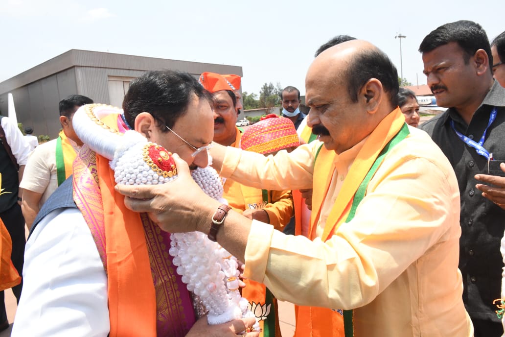ಬಳ್ಳಾರಿ: ವಿಜಯನಗರದಲ್ಲಿ ಆರಂಭವಾಗಿರುವ ರಾಜ್ಯ ಬಿಜೆಪಿ ಕಾರ್ಯಕಾರಣಿ ಸಭೆಯಲ್ಲಿ ಭಾಗವಹಿಸಲು ಬಳ್ಳಾರಿ ಜಿಲ್ಲೆಯ ತೋರಣಗಲ್ಲ ವಿಮಾನ ನಿಲ್ದಾಣಕ್ಕೆ ಆಗಮಿಸಿದ ಬಿಜೆಪಿ ರಾಷ್ಟ್ರೀಯ ಅಧ್ಯಕ್ಷ ಜೆ ಪಿ ನಡ್ಡಾ ಅವರನ್ನು ಮುಖ್ಯಮಂತ್ರಿ ಬಸವರಾಜ ಬೊಮ್ಮಾಯಿ ಆತ್ಮೀಯವಾಗಿ ಬರಮಾಡಿಕೊಂಡರು.