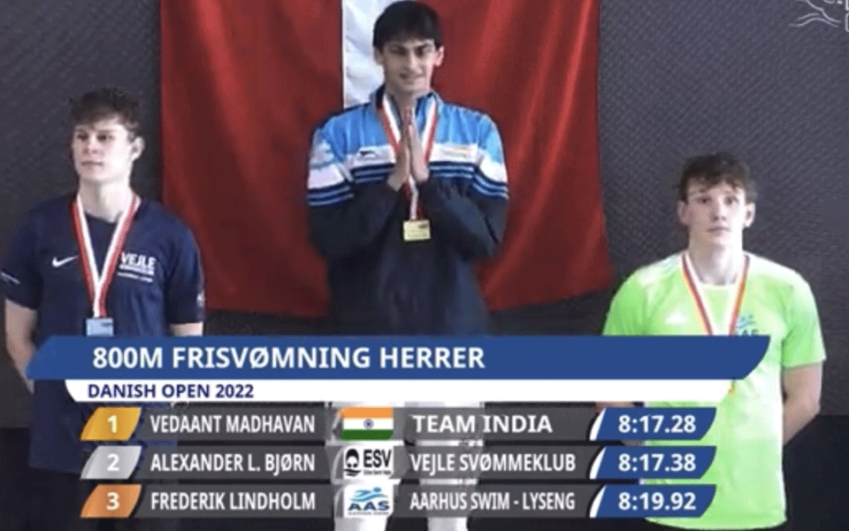 ಶನಿವಾರ ಡ್ಯಾನಿಶ್ ಓಪನ್ ಈಜು ಕೂಟದಲ್ಲಿ ವೇದಾಂತ್ ಮಾಧವನ್ 1,500 ಮೀಟರ್ ಫ್ರೀಸ್ಟೈಲ್ ಈಜು ಸ್ಪರ್ಧೆಯಲ್ಲಿ 15:57:86 ಸೆಕೆಂಡ್ ನಲ್ಲಿ ಗುರಿ ತಲುಪಿ ಬೆಳ್ಳಿ ಪದಕ ಜಯಿಸಿದ್ದರು.