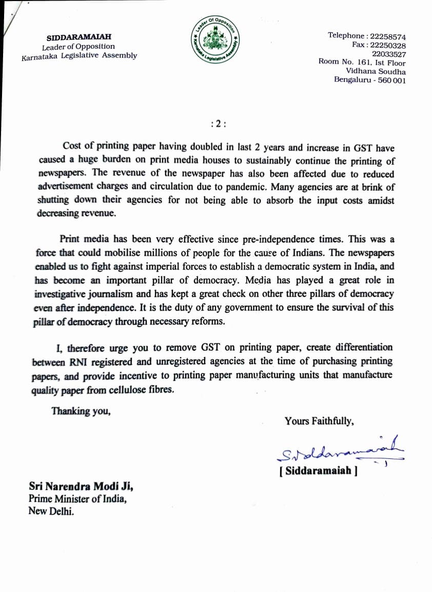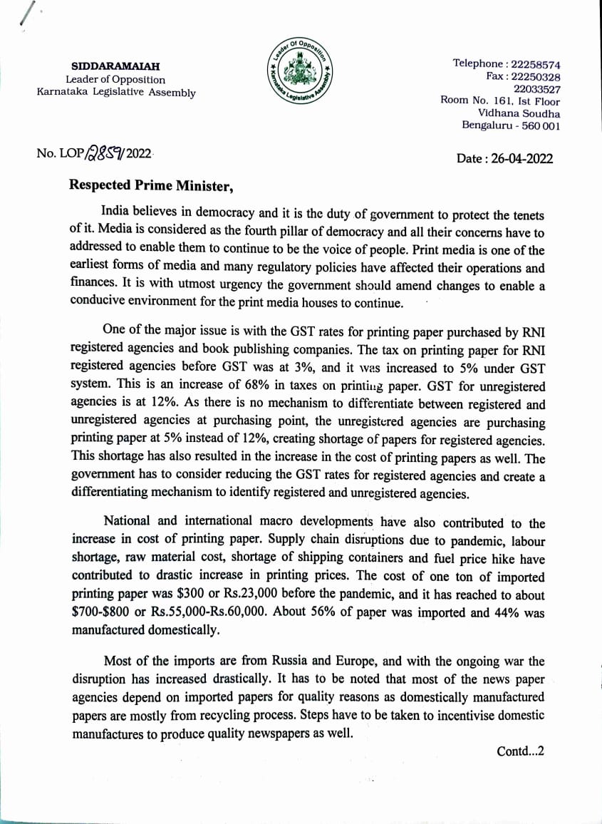 ಬೆಂಗಳೂರು: 'ಕೇಂದ್ರದ ಸರ್ಕಾರದ ಕೆಲವು ಕ್ರಮಗಳು ಮತ್ತು ನೀತಿಗಳು ಮುದ್ರಣ ಮಾಧ್ಯಮ ನಿರಾತಂಕವಾಗಿ ಮುಂದುವರಿಯಲು ಸಾಧ್ಯವಿಲ್ಲದ ಪರಿಸ್ಥಿತಿಯನ್ನು ಸೃಷ್ಟಿಸಿದೆ. ಹೀಗಾಗಿ ಜಿಎಸ್ಟಿ ಪ್ರಮಾಣವನ್ನು ಇಳಿಸಿ ಪತ್ರಿಕಾ ಸಂಸ್ಥೆಗಳಿಗೆ ಮುದ್ರಣ ಕಾಗದದ ಲಭ್ಯತೆ ಸುಗಮವಾಗಿ ಮತ್ತು ಸರಳವಾಗಿರುವಂತೆ ನೀತಿ ರೂಪಿಸಬೇಕು' ಎಂದು ಒತ್ತಾಯಿಸಿ ವಿಧಾನಸಭೆ ವಿಪಕ್ಷ ನಾಯಕ ಸಿದ್ದರಾಮಯ್ಯ ಪ್ರಧಾನಿ ನರೇಂದ್ರ ಮೋದಿಗೆ ಪತ್ರ ಬರೆದಿದ್ದಾರೆ.