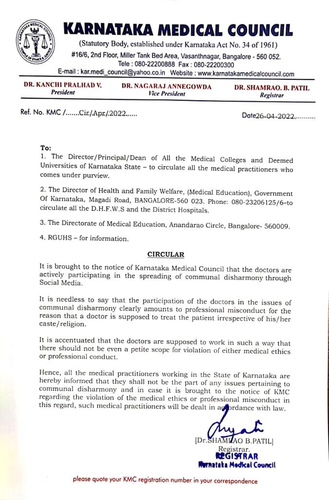“ಸಾಮಾಜಿಕ ಜಾಲತಾಣಗಳ ಮೂಲಕ ಕೋಮು ವೈಷಮ್ಯ ಹರಡುವಲ್ಲಿ ವೈದ್ಯರು ಸಕ್ರಿಯವಾಗಿ ಪಾಲ್ಗೊಳ್ಳುತ್ತಿದ್ದಾರೆ ಎಂದು ಕರ್ನಾಟಕ ವೈದ್ಯಕೀಯ ಮಂಡಳಿಯ ಗಮನಕ್ಕೆ ಬಂದಿದೆ. ವೈದ್ಯರು ರೋಗಿಗೆ ಅವರ ಜಾತಿ/ಧರ್ಮವನ್ನು ಲೆಕ್ಕಿಸದೆ ಚಿಕಿತ್ಸೆ ನೀಡಬೇಕು ಎಂಬ ಹಿನ್ನೆಲೆಯಲ್ಲಿ, ವೈದ್ಯರು ಕೋಮು ವೈಷಮ್ಯದಲ್ಲಿ ತೊಡಗುವುದು ವೈದ್ಯರ ವೃತ್ತಿಪರ ದುಷ್ಕೃತ್ಯಕ್ಕೆ ಕಾರಣವಾಗುತ್ತದೆ''.