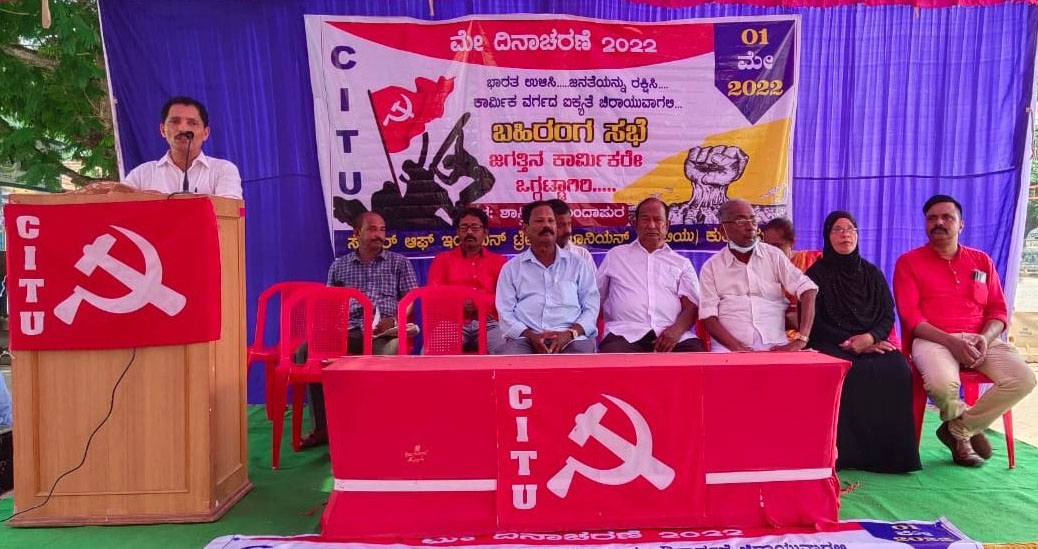 ಕುಂದಾಪುರದಲ್ಲೂ ಸಭೆ: ಸಿಐಟಿಯು ಕುಂದಾಪುರ ವತಿಯಿಂದ ರವಿವಾರ ಶಾಸ್ತ್ರೀ ವೃತ್ತದಲ್ಲಿ ನಡೆದ ಕಾರ್ಮಿಕರ ದಿನಾಚರಣೆ ಬಹಿರಂಗ ಸಭೆಯನ್ನುದ್ದೇಶಿಸಿ ಸಿಐಟಿಯು ರಾಜ್ಯ ಸಮಿತಿ ಸದಸ್ಯ ಎಚ್.ನರಸಿಂಹ ಮಾತನಾಡಿ, ಕೇಂದ್ರ ಬಿಜೆಪಿ ಸರಕಾರದ ಕಾರ್ಮಿಕ ವಿರೋಧಿ ನೀತಿಗಳಿಂದ ಕಾರ್ಮಿಕ ಕುಟುಂಬಗಳು ಇಂದು ಬೀದಿಗೆ ಬಿದ್ದಿವೆ. ಕರಾವಳಿ ಭಾಗದಲ್ಲಿ ಸಹಸ್ರಾರು ಕುಟುಂಬಗಳಿಗೆ ಆಸರೆ ಯಾಗಿದ್ದ ಹೆಂಚು ಉದ್ಯಮಗಳಿಂದು ಅಳಿವಿನ ಅಂಚಿನಲ್ಲಿದೆ. ಶೇ.೧೨ರಷ್ಟು ಜಿಎಸ್ಟಿಯನ್ನು ಅಳಿವಿನ ಅಂಚಿನಲ್ಲಿರುವ ಹೆಂಚು ಉದ್ಯಮಕ್ಕೆ ಹಾಗೂ ಬಟ್ಟೆ ವ್ಯಾಪಾರಸ್ಥರ ಮೇಲೆ ವಿಧಿಸಿ ನಾಶ ಮಾಡಲಾಗುತ್ತಿದೆ ಎಂದು ಆರೋಪಿಸಿದರು.
