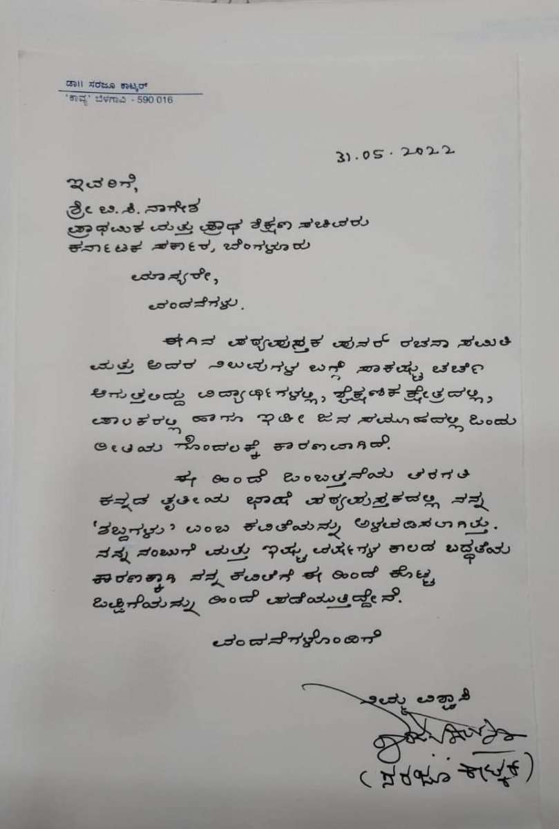 'ಪಠ್ಯ ಪರಿಷ್ಕರಣೆ ವಿವಾದ ಇಡೀ ಜನ ಸಮೂಹದಲ್ಲಿ ಒಂದು ರೀತಿಯ ಗೊಂದಲಕ್ಕೆ ಕಾರಣವಾಗಿದ್ದು, ಪಠ್ಯದಿಂದ ನನ್ನ 'ಶಬ್ದಗಳು' ಎ೦ಬ ಕವಿತೆಯನ್ನು ಕೈ ಬಿಡಿ' ಎಂದು ಸಾಹಿತಿ, ಕವಿ, ಡಾ. ಸರಜೂ ಕಾಟ್ಕರ್ ಪ್ರಾಥಮಿಕ ಮತ್ತು ಪ್ರೌಢ ಶಿಕ್ಷಣ ಸಚಿವ ಬಿ.ಸಿ ನಾಗೇಶ್ ಗೆ ಪತ್ರ ಬರೆದಿದ್ದಾರೆ.
