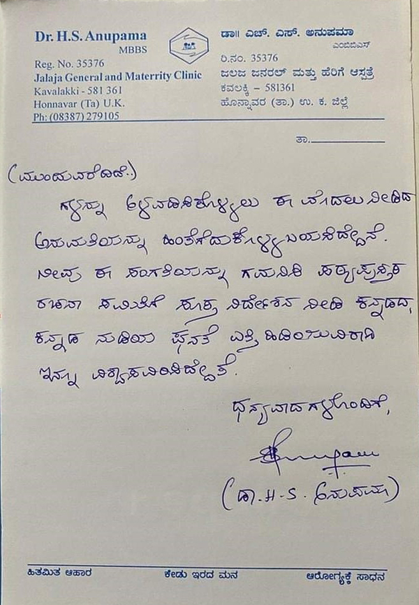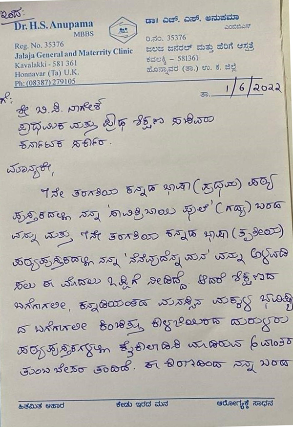 ಎಚ್.ಎಸ್ ಅನುಪಮಾ ಅವರು ಸಚಿವ ಬಿ.ಸಿ ನಾಗೆಶ್ ಅವರಿಗೆ ಬರೆದ ಪತ್ರ