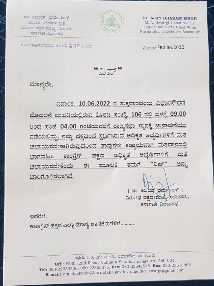 'ಶುಕ್ರವಾರದಂದು ವಿಧಾನಸೌಧದ ಮೊದಲನೆ ಮಹಡಿಯಲ್ಲಿರುವ ಕೊಠಡಿ ಸಂಖ್ಯೆ 106 ರಲ್ಲಿ ಬೆಳಗ್ಗೆ 09.00 ರಿಂದ ಸಂಜೆ 04.00 ಗಂಟೆಯವರೆಗೆ ರಾಜ್ಯಸಭಾ ಸ್ಥಾನಕ್ಕೆ ಚುನಾವಣೆಯು ನಡೆಯಲಿದ್ದು, ನಮ್ಮ ಪಕ್ಷದಿಂದ ಸ್ಪರ್ಧಿಸಿರುವ ಅಧಿಕೃತ ಅಭ್ಯರ್ಥಿಗಳಿಗೆ ಮತ ಚಲಾಯಿಸಬೇಕು' ಎಂದು ವಿಪ್ ಜಾರಿಗೊಳಿಸಿ ಪಕ್ಷದ ಎಲ್ಲ ಶಾಸಕರಿಗೂ ಪತ್ರದ ಮೂಲಕ ವಿಧಾನಸಭೆಯ ವಿರೋಧ ಪಕ್ಷದ ಮುಖ್ಯ ಸಚೇತಕ ಡಾ. ಅಜಯ್ ಸಿಂಗ್ ನಿರ್ದೇಶನ ನೀಡಿದ್ದಾರೆ.