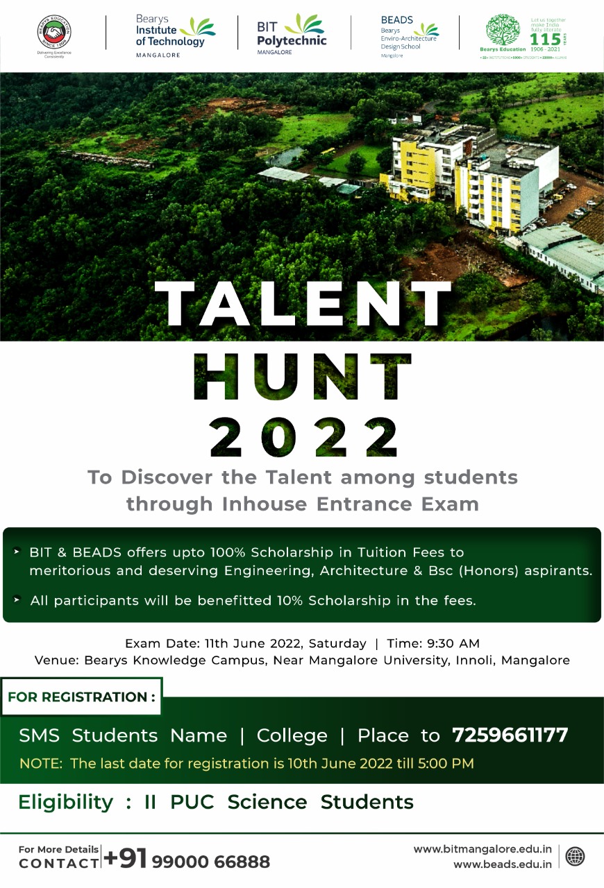 ಮಂಗಳೂರು, ಜೂ.10: ವಿದ್ಯಾರ್ಥಿಗಳಲ್ಲಿನ ಪ್ರತಿಭೆಗಳನ್ನು ಪ್ರವೇಶ ಪರೀಕ್ಷೆಯ ಮೂಲಕ ಪತ್ತೆಹಚ್ಚುವ ಸಲುವಾಗಿ ಬಿಐಟಿ (ಬ್ಯಾರೀಸ್ ಇನ್ಸ್ಟಿಟ್ಯೂಟ್ ಆಫ್ ಟೆಕ್ನಾಲಜಿ) ವತಿಯಿಂದ 'ಟ್ಯಾಲೆಂಟ್ ಹಂಟ್ 2022'ನನ್ನು ಆಯೋಜಿಸಲಾಗಿದೆ.