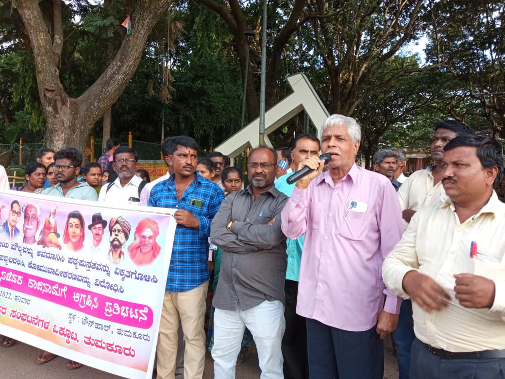 ತುಮಕೂರು: ಪ್ರಗತಿಪರ ಸಂಘಟನೆಗಳ ಒಕ್ಕೂಟದಿಂದ ಮಾನವೀಯ ಮೌಲ್ಯಗಳನ್ನು ಅವಮಾನಿಸಿ ಪಠ್ಯಕ್ರಮವನ್ನು ವಿಕೃತಗೊಳಿಸಿ ಪಠ್ಯ ಬದಲಿಸಿ ಕೋಮುವಾಧಿಕರಣ ವಿರೋಧಿಸಿ ಪ್ರಾಥಮಿಕ ಮತ್ತು ಪ್ರೌಢ ಶಿಕ್ಷಣ ಸಚಿವ ಬಿ.ಸಿ ನಾಗೇಶ್ ರಾಜಿನಾಮೆಗೆ ಆಗ್ರಹಿಸಿ ಪ್ರತಿಭಟನೆ ನಡೆಸಲಾಯಿತು.