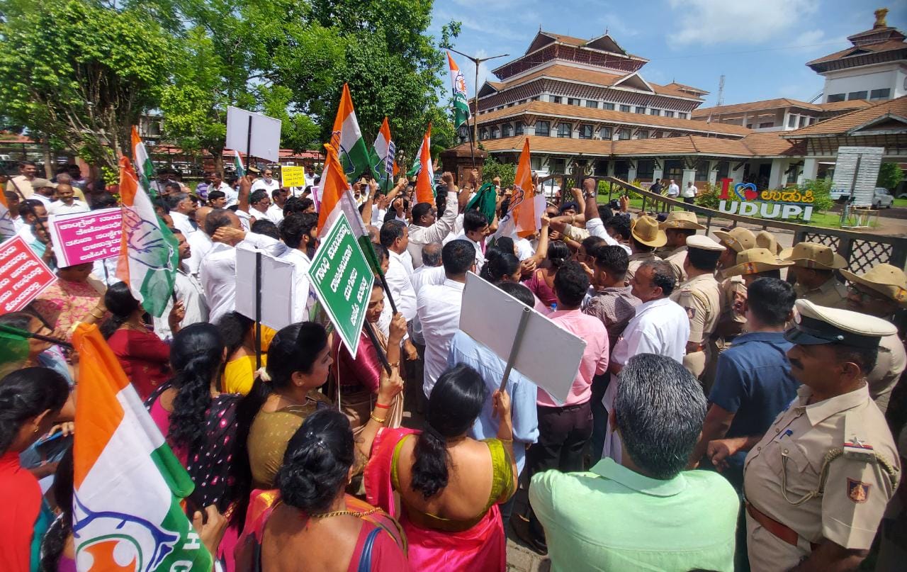 ಮಣಿಪಾಲದ ಕಾಯಿನ್ ಸರ್ಕಲ್ನಿಂದ ಹೊರಟ ಪ್ರತಿಭಟನಾ ಮೆರವಣಿಗೆ ಜಿಲ್ಲಾಧಿಕಾರಿ ಕಚೇರಿವರೆಗೆ ನಡೆಯಿತು. ಬಳಿಕ ಕಾಂಗ್ರೆಸ್ ಮುಖಂಡರು ಹಾಗೂ ಕಾರ್ಯಕರ್ತರು ಗೇಟಿನ ಮೂಲಕ ಜಿಲ್ಲಾಧಿಕಾರಿ ಕಚೇರಿ ಆವರಣದೊಳಗೆ ನುಗ್ಗಲು ಯತ್ನಿಸಿದರು. ಆದರೆ ಪೊಲೀಸರು ಗೇಟು ಹಾಕಿ ಪ್ರತಿಭಟನಾಕಾರರನ್ನು ಒಳ ಪ್ರವೇಶಿಸಿದಂತೆ ತಡೆದರು.