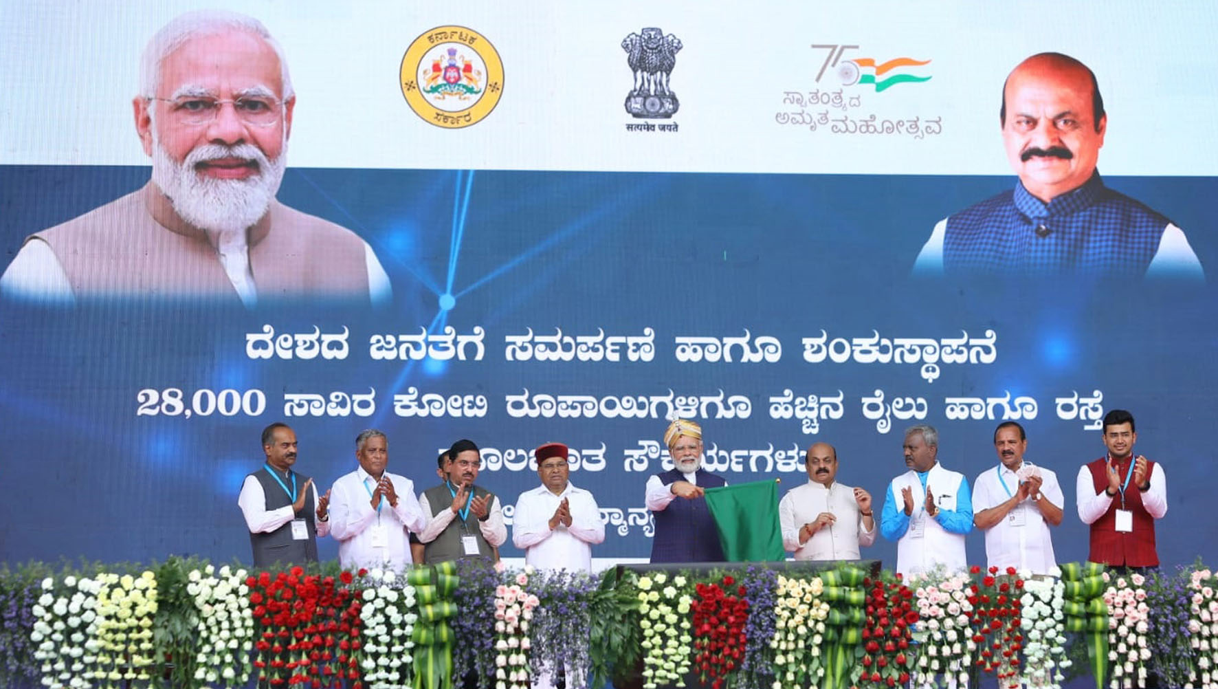ಬೆಂಗಳೂರು, ಜೂ. 20: ಸುಮಾರು 15,767 ಕೋಟಿ ರೂ.ವೆಚ್ಚದ 148 ಕಿ.ಮೀ ಉದ್ದದ ಬೆಂಗಳೂರಿನ ಉಪನಗರ ರೈಲ್ವೆ(ಸಬ್ ಅರ್ಬನ್) ಯೋಜನೆ ಸೇರಿದಂತೆ ಸುಮಾರು 33 ಸಾವಿರ ಕೋಟಿ ರೂ.ವೆಚ್ಚದ 19 ವಿವಿಧ ಅಭಿವೃದ್ಧಿ ಯೋಜನೆಗಳ ಉದ್ಘಾಟನೆ ಹಾಗೂ ಶಂಕುಸ್ಥಾಪನೆಯನ್ನು ಪ್ರಧಾನಿ ನರೇಂದ್ರ ಮೋದಿ ಅವರು ನೆರವೇರಿಸಿದರು.