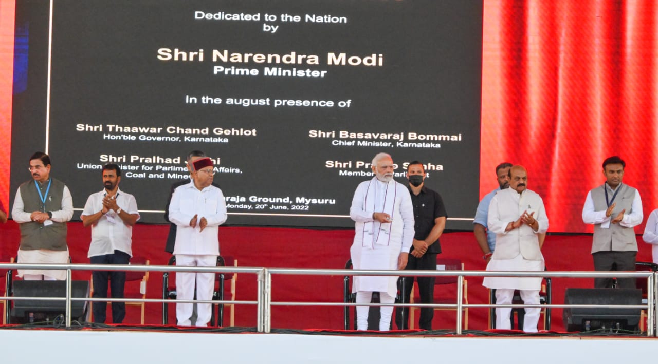 ನಗರದ ಮಹರಾಜವಕಾಲೇಜು ಮೈದಾನದಲ್ಲಿ ಕೇಂದ್ರ ಮತ್ತು ರಾಜ್ಯ ಸರ್ಕಾರದ ಫಲಾನುಭವಿಗಳೊಂದಿಗೆ ಸೋಮವಾರ ಸಂವಾದ ನಡೆಸಿ ನಂತರ ಅಖಿಲ ಭಾತರ ವಾಕ್ ಮತ್ತು ಶ್ರವಣ ಸಂಸ್ಥೆಯ ಉತ್ಕೃಷ್ಟ ಕಟ್ಟಡ ಲೋಕಾರ್ಪಣೆಗೊಳಿಸಿ ನಾಗನಹಳ್ಳಿ ಮೈಸೂರು ನೂತನ ರೈಲ್ವೆ ಕೋಚಿಂಗ್ ಕಾಂಪ್ಲೆಕ್ಸ್ ಶಂಕುಸ್ಥಾಪನೆ ನೆರವೇರಿಸಿ ಮಾತನಾಡಿದರು.