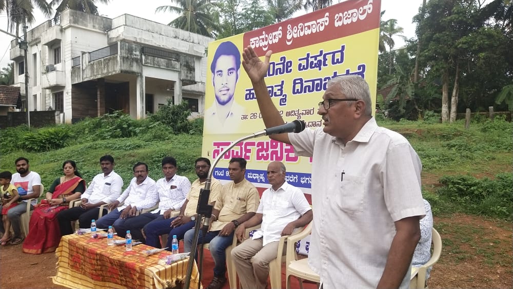 ಬಜಾಲ್ ಪಕ್ಕಲಡ್ಕ ಮೈದಾನದಲ್ಲಿ ರವಿವಾರ ನಡೆದ ಡಿವೈಎಫ್ಐ ಮುಖಂಡ ಶ್ರೀನಿವಾಸ್ ಬಜಾಲ್ ಅವರ 20ನೇ ವರ್ಷದ ಹುತಾತ್ಮ ದಿನದ ಅಂಗವಾಗಿ ಕೋಮುವಾದಿ ವಿರೋಧಿ ಅಭಿಯಾನ ಸಾಮರಸ್ಯ ಸಭೆಯಲ್ಲಿ ಪ್ರಮುಖ ಭಾಷಣಕಾರರಾಗಿ ಮಾತನಾಡುತ್ತಿದ್ದರು.