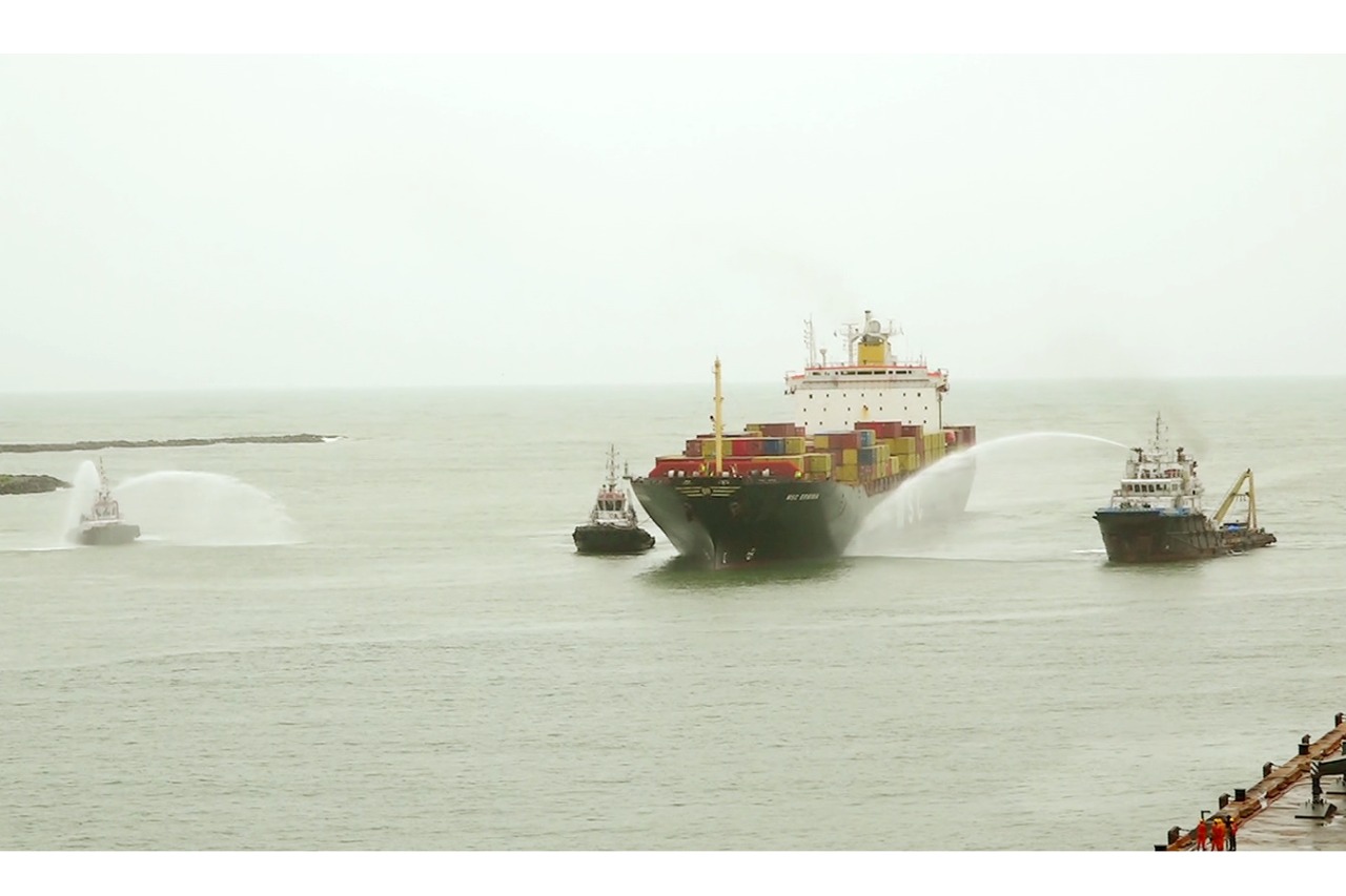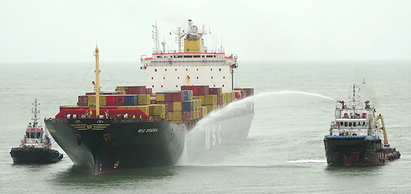 ಮಂಗಳೂರು, ಜು.3: ನವಮಂಗಳೂರು ಬಂದರಿಗೆ ಭಾರಿ ಗಾತ್ರದ ಸರಕು ಸಾಗಾಟದ ಹಡಗು ಆಗಮಿಸಿದ್ದು ಅದನ್ನು ನೀರು ಹಾಯಿಸುವ ಮೂಲಕ ಸ್ವಾಗತಿಸಲಾಯಿತು.