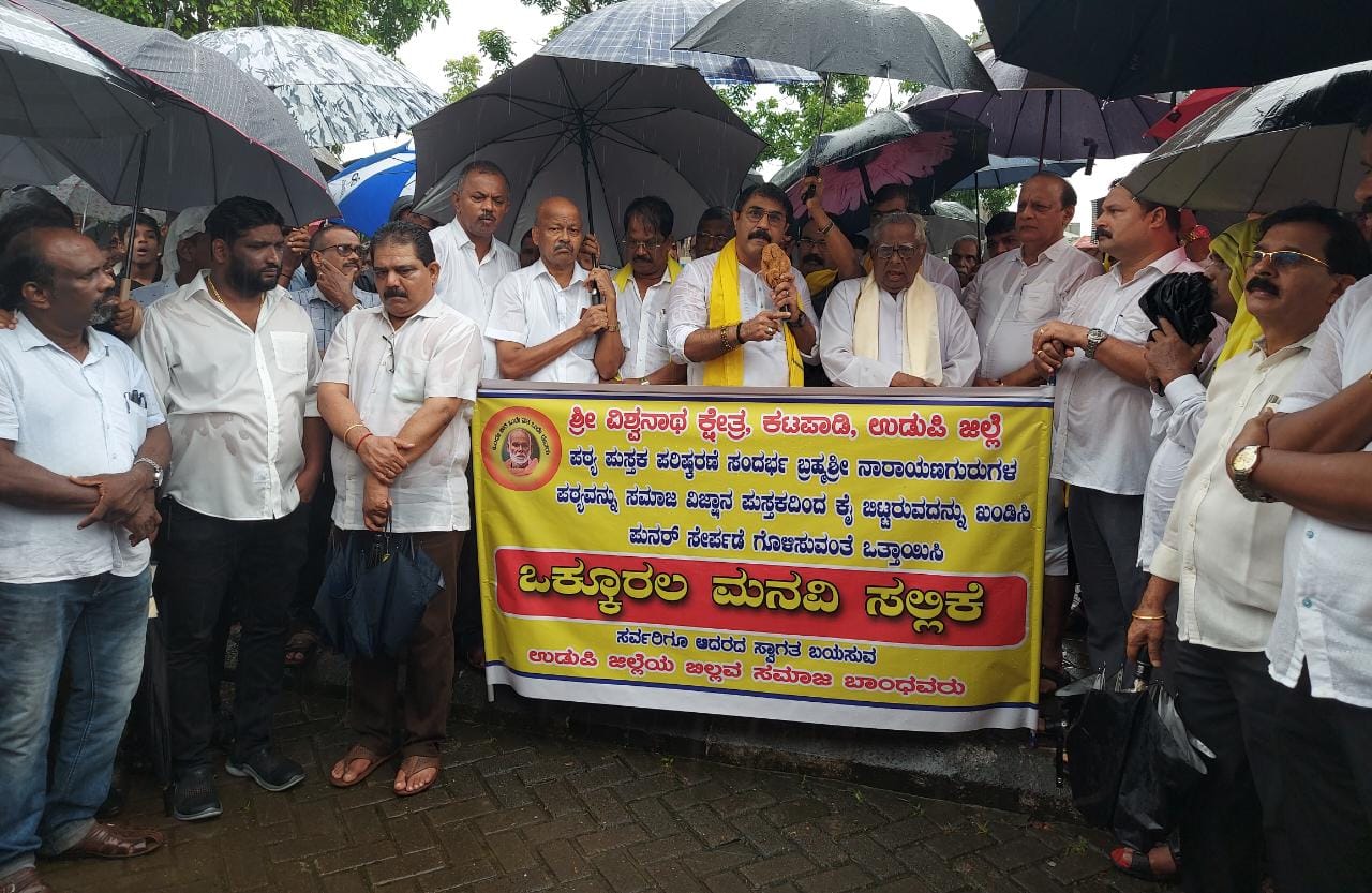ಪಠ್ಯ ಪುಸ್ತಕ ಪರಿಷ್ಕರಣೆಯಲ್ಲಿ ಬ್ರಹ್ಮಶ್ರೀ ನಾರಾಯಣ ಗುರುಗಳ ಪಠ್ಯವನ್ನು ಸಮಾಜ ವಿಜ್ಞಾನದಿಂದ ಕೈಬಿಟ್ಟಿರುವುದನ್ನು ಖಂಡಿಸಿ ಕಟಪಾಡಿ ಶ್ರೀ ವಿಶ್ವನಾಥ ಕ್ಷೇತ್ರದ ನೇತೃತ್ವದಲ್ಲಿ ಉಡುಪಿ ಜಿಲ್ಲಾಧಿಕಾರಿ ಕಚೇರಿ ಎದುರು ಶುಕ್ರವಾರ ಹಮ್ಮಿಕೊಳ್ಳಲಾದ ಪ್ರತಿಭಟನಾ ಸಭೆಯನ್ನುದ್ದೇಶಿಸಿ ಅವರು ಮಾತನಾಡುತಿದ್ದರು.