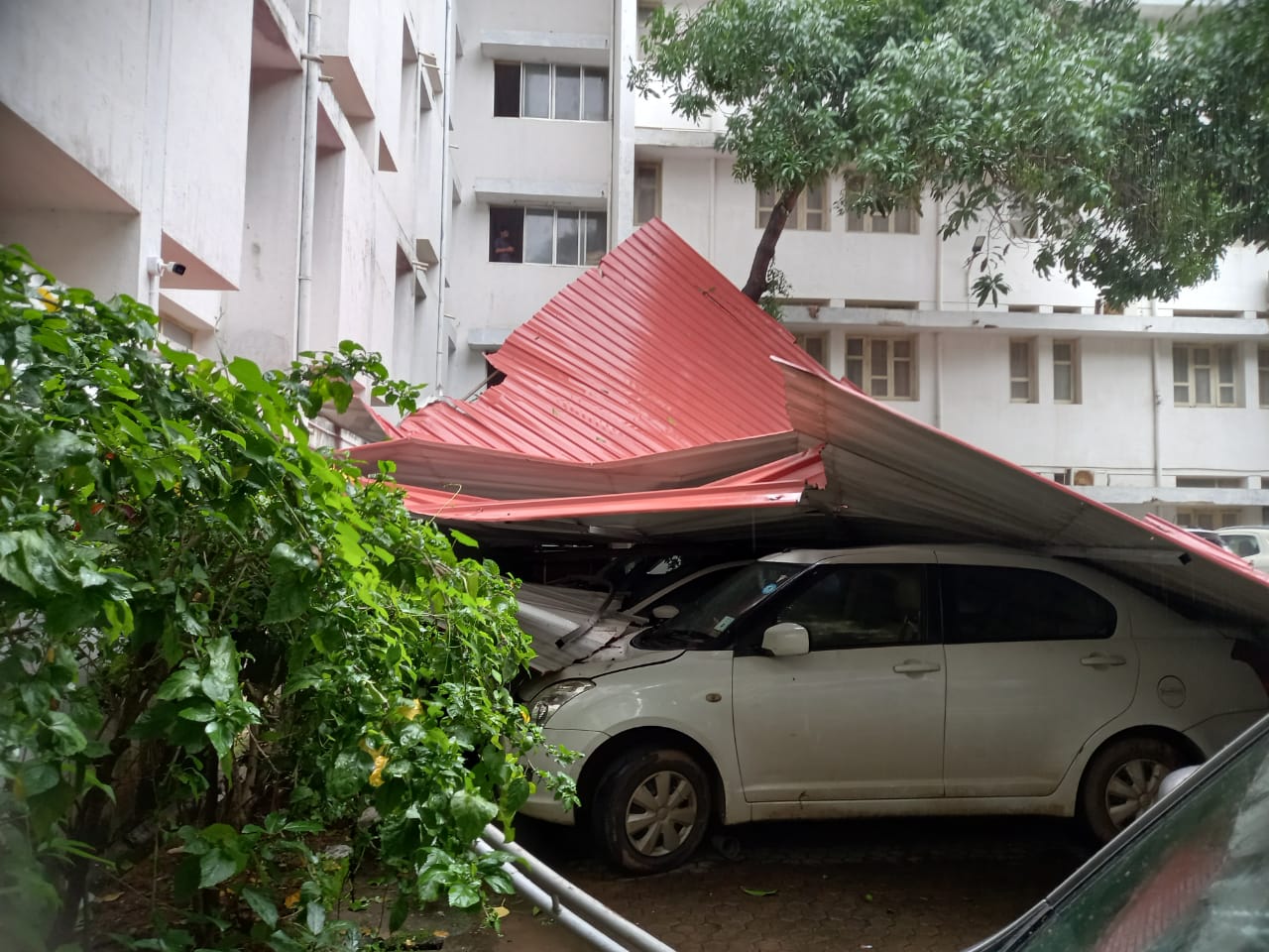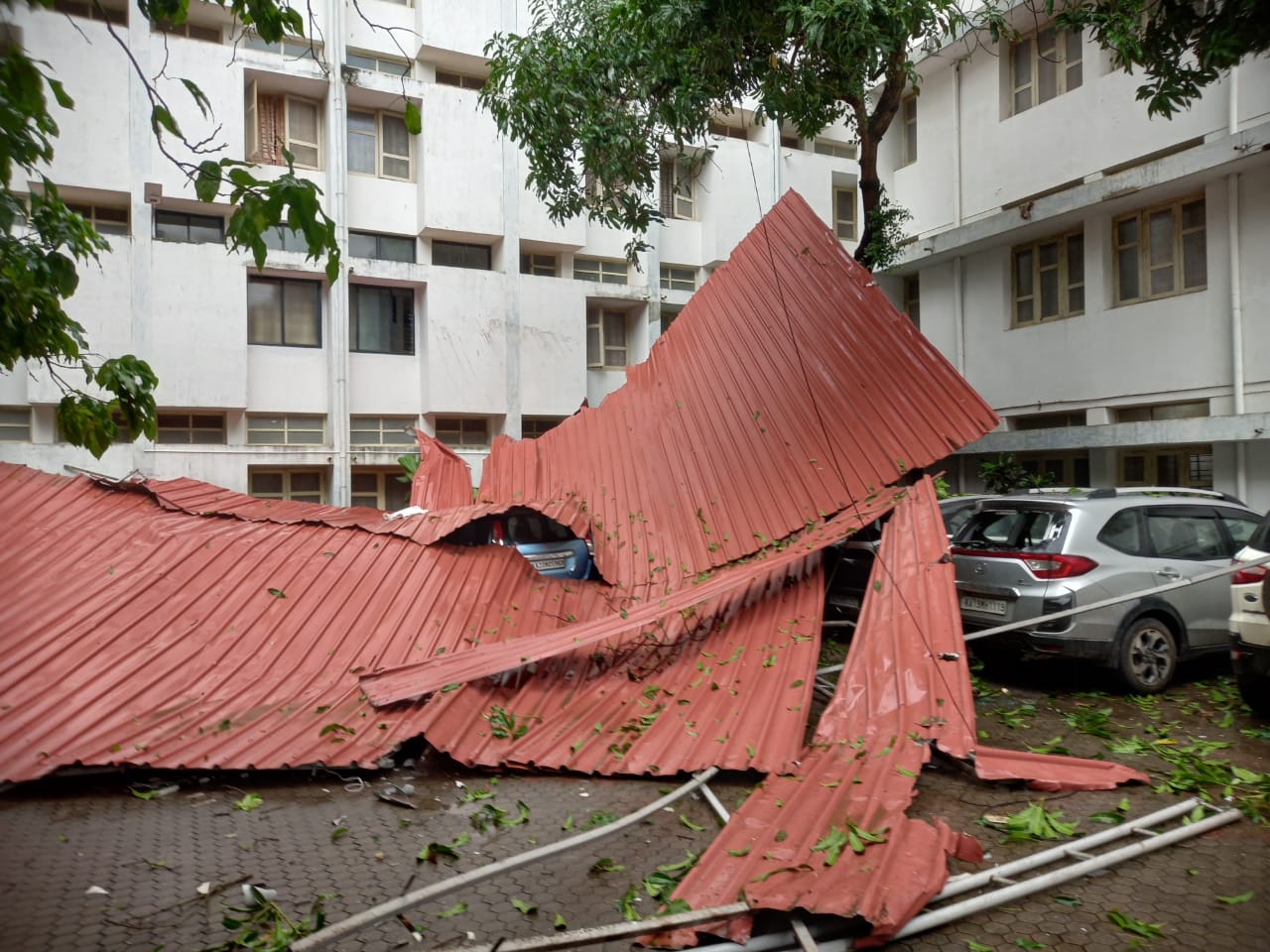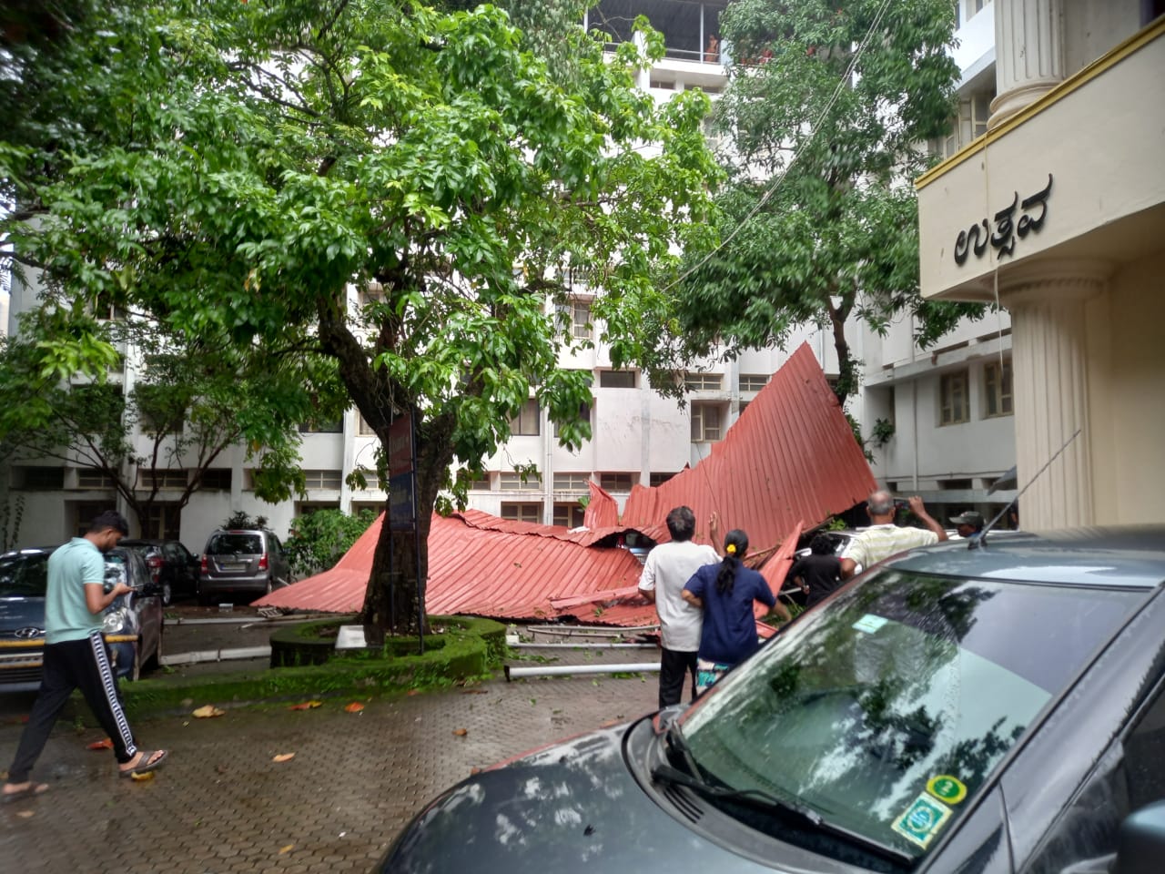 ಭಾರೀ ಗಾಳಿಯೊಂದಿಗೆ ಸುರಿದ ಮಳೆಗೆ ಶೀಟು ಹಾರಿ ಬಿದ್ದಿದ್ದು, ಅಲ್ಲಿ ನಿಲ್ಲಿಸಿದ್ದ ಆರು ಕಾರುಗಳಿಗೆ ಹಾನಿಯಾಗಿದೆ. ಘಟನೆಯಿಂದ ಯಾವುದೇ ಪ್ರಾಣಹಾನಿಯಾಗಿಲ್ಲ.