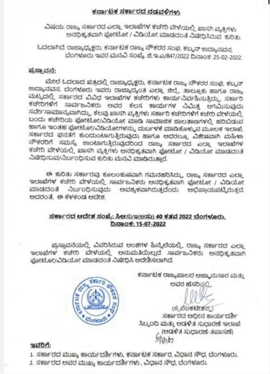 ಇನ್ನು ಮುಂದೆ ಅನುಮತಿ ಇಲ್ಲದೆ ರಾಜ್ಯದ ಸರ್ಕಾರಿ ಕಚೇರಿಗಳ ವೀಡಿಯೊ, ಫೋಟೊ ತೆಗೆಯುವಂತಿಲ್ಲ: ಆದೇಶ