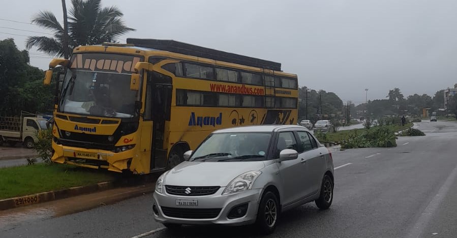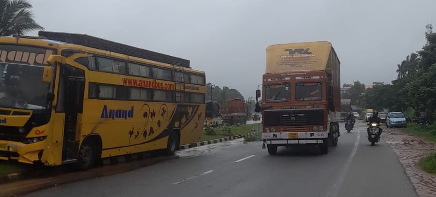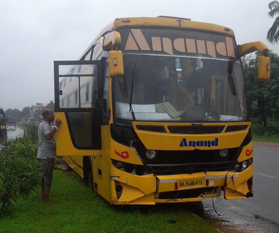 ಮುಂಬೈನಿಂದ ಮಂಗಳೂರಿನತ್ತ ಸಾಗುತ್ತಿದ್ದ ಆನಂದ್ ಹೆಸರಿನ ಖಾಸಗಿ ಬಸ್ ಕುಂಭಾಸಿ ಸಮೀಪದ ಕೊರವಡಿ ಕ್ರಾಸ್ ಬಳಿ ಹೆದ್ದಾರಿ ಹೊಂಡಕ್ಕೆ ಬಸ್ ಟಯರ್ ಇಳಿದಾಗ ಬಸ್ ಚಾಲಕನ ನಿಯಂತ್ರಣ ಕಳೆದುಕೊಂಡು ಸುಮಾರು 300 ಮೀಟರ್ ದೂರ ಡಿವೈಡರ್ ಏರಿ ಸಾಗಿದ್ದು ಚಾಲಕನ ಜಾಗರುಕತೆಯಿಂದಾಗಿ ಪಲ್ಟಿಯಾಗುವುದು ತಪ್ಪಿದಂತಾಗಿದೆ. ಹೀಗೆ ಅಪಾಯದಲ್ಲಿ ಸಾಗಿದ ಬಸ್ ಕನ್ನುಕೆರೆ ಮಸೀದಿ ಎದುರು ಡಿವೈಡರ್ ಏರಿ ನಿಂತಿದೆ. ಬಸ್ಸಿನಲ್ಲಿ 40ಕ್ಕೂ ಅಧಿಕ ಪ್ರಯಾಣಿಕರು ಇದ್ದರು ಎಂದು ತಿಳಿದುಬಂದಿದ್ದು ಯಾವುದೇ ಅಪಾಯ ಸಂಭವಿಸಿಲ್ಲ.