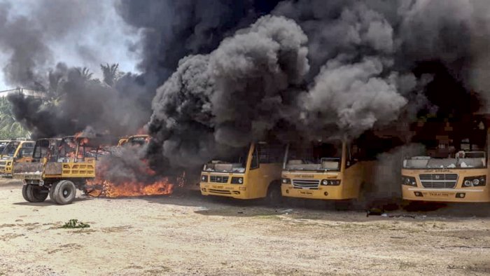 ಪ್ರತಿಭಟನಾಕಾರರು ರವಿವಾರ ಶಾಲಾ ಬಸ್ಗಳು , ಪೊಲೀಸ್ ವಾಹನಗಳಿಗೆ ಬೆಂಕಿ ಹಚ್ಚಿರುವ ದೃಶ್ಯ, Photo:PTI