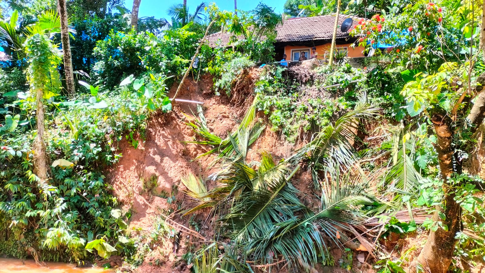ಕೊಣಾಜೆ: ಕೊಣಾಜೆ ಗ್ರಾಮದ ಪುರುಷಕೋಡಿ ಎಂಬಲ್ಲಿ ಶುಕ್ರವಾರ ರಾತ್ರಿಯಿಂದ ಸುರಿಯುತ್ತಿರುವ ಧಾರಾಕಾರ ಮಳೆಗೆ ತೋಡಿನ ಬದು ಕುಸಿತವಾಗಿ ಮೋನಪ್ಪ ಗೌಡ ಎಂಬವರ ಮನೆ ಅಂಗಳವು ಭಾಗಷಃ ಕುಸಿದು ಮನೆಯು ಅಪಾಯದಲ್ಲಿದೆ.