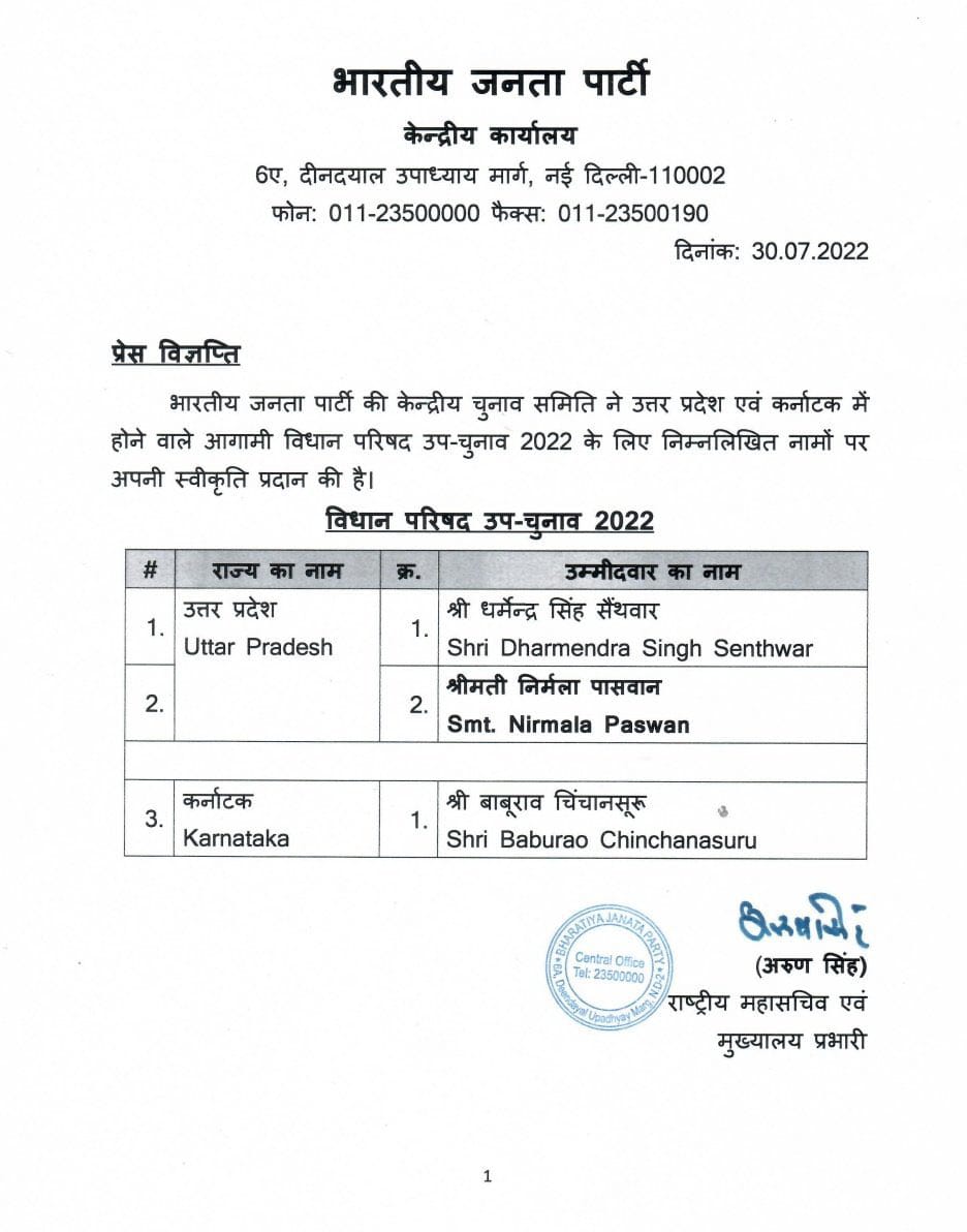 ಪರಿಷತ್ ಉಪ ಚುನಾವಣೆ: ಬಾಬುರಾವ್ ಚಿಂಚನಸೂರು ಬಿಜೆಪಿ ಅಭ್ಯರ್ಥಿ