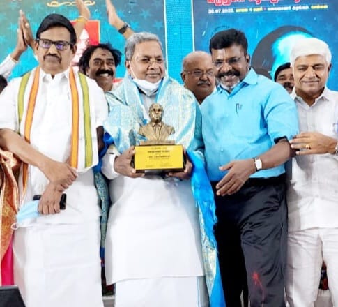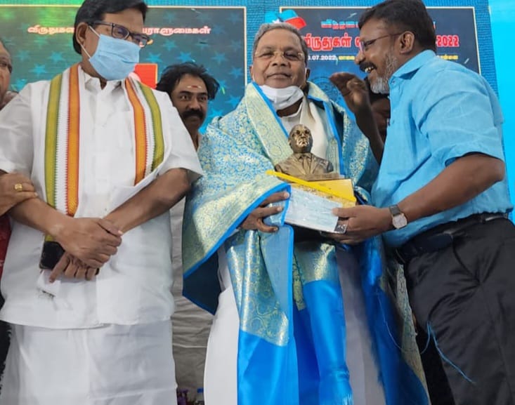 ಚೆನ್ನೈ, ಜು. 30: ತಮಿಳುನಾಡಿನ 'ವಿಡುದಲೈ ಚಿರುದೈಗಳ್ ಪಕ್ಷ' ಚೆನ್ನೈನಲ್ಲಿ ಆಯೋಜಿಸಿದ್ದ ಸಮಾರಂಭದಲ್ಲಿ ಪಕ್ಷದ ಮುಖ್ಯಸ್ಥ ಹಾಗೂ ಸಂಸದ ತೋಲ್ ತಿರುಮಾವಳವನ್ ಅವರು ವಿಪಕ್ಷ ನಾಯಕ ಸಿದ್ದರಾಮಯ್ಯ ಅವರಿಗೆ 'ಡಾ.ಬಿ.ಆರ್. ಅಂಬೇಡ್ಕರ್ ಸುಡರ್' ಪ್ರಶಸ್ತಿ ಪ್ರದಾನ ಮಾಡಿ ಗೌರವಿಸಿದರು.