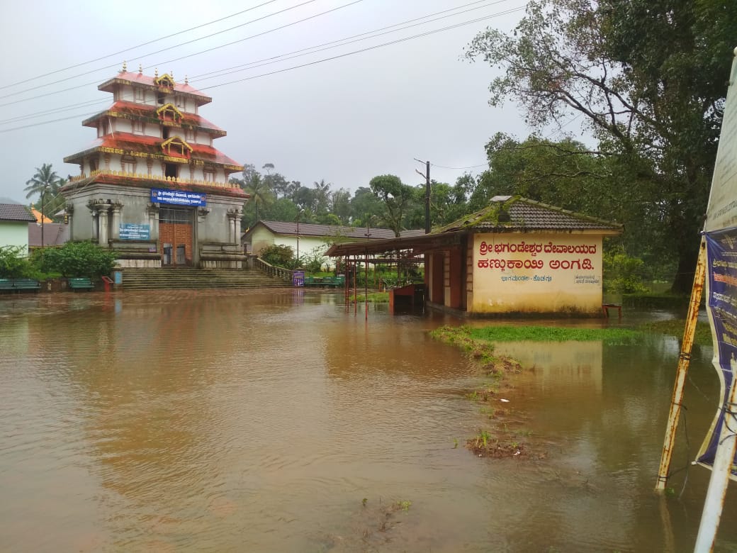 ಮಡಿಕೇರಿ: ಕೊಡಗು ಜಿಲ್ಲೆಯಾದ್ಯಂತ ಮಳೆ ತೀವ್ರತೆಯನ್ನು ಪಡೆದುಕೊಂಡಿದೆ. ಬಿಡುವು ನೀಡದ ಮಳೆಯಿಂದ ಹಲವು ರಸ್ತೆಗಳು ಜಲಾವೃತಗೊಂಡಿದ್ದು, ಭಾಗಮಂಡಲದ ತ್ರಿವೇಣಿ ಸಂಗಮ ಉಕ್ಕಿ ಹರಿಯುತ್ತಿದೆ. ಇಲ್ಲಿನ ಶ್ರೀ ಭಗಂಡೇಶ್ವರ ದೇವಾಲಯದ ಆವರಣಕ್ಕೆ ಪ್ರವಾಹದ ನೀರು ಬಂದಿದೆ.