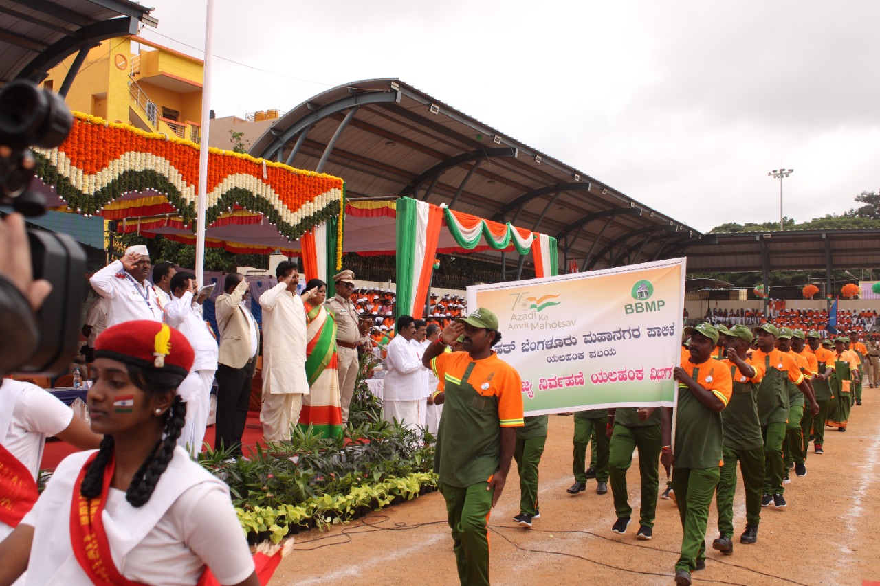 ಯಲಹಂಕದಲ್ಲಿ ಸ್ವಾತಂತ್ರ್ಯದ ಅಮೃತ ಮಹೋತ್ಸವದಲ್ಲಿ ನೂರಾರು ಪೌರ ಕಾರ್ಮಿಕರು ಶಿಸ್ತುಬದ್ಧವಾಗಿ ಪಥಸಂಚಲನ ನಡೆಸಿ ಎಲ್ಲರ ಮೆಚ್ಚುಗೆಗೆ ಪಾತ್ರರಾದರು.