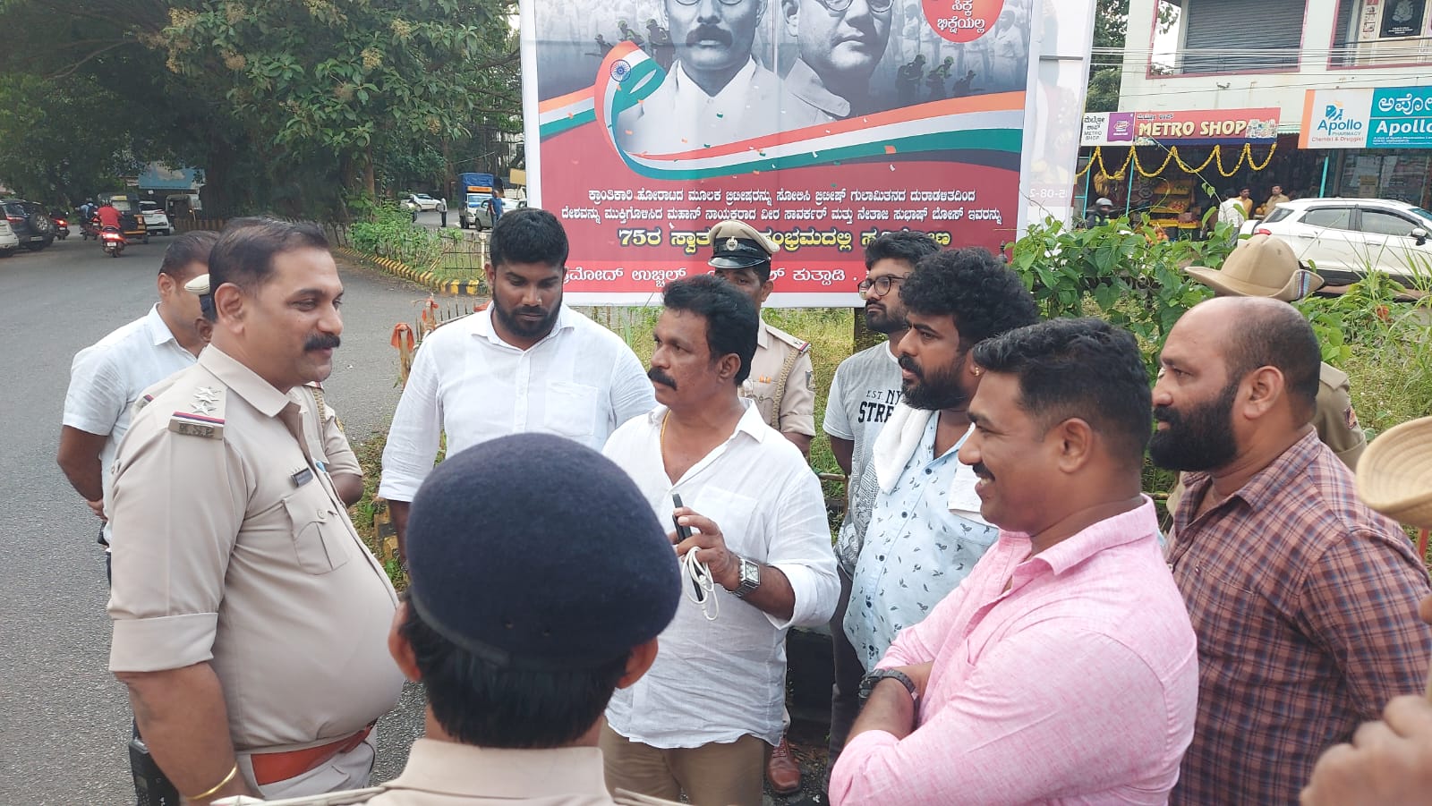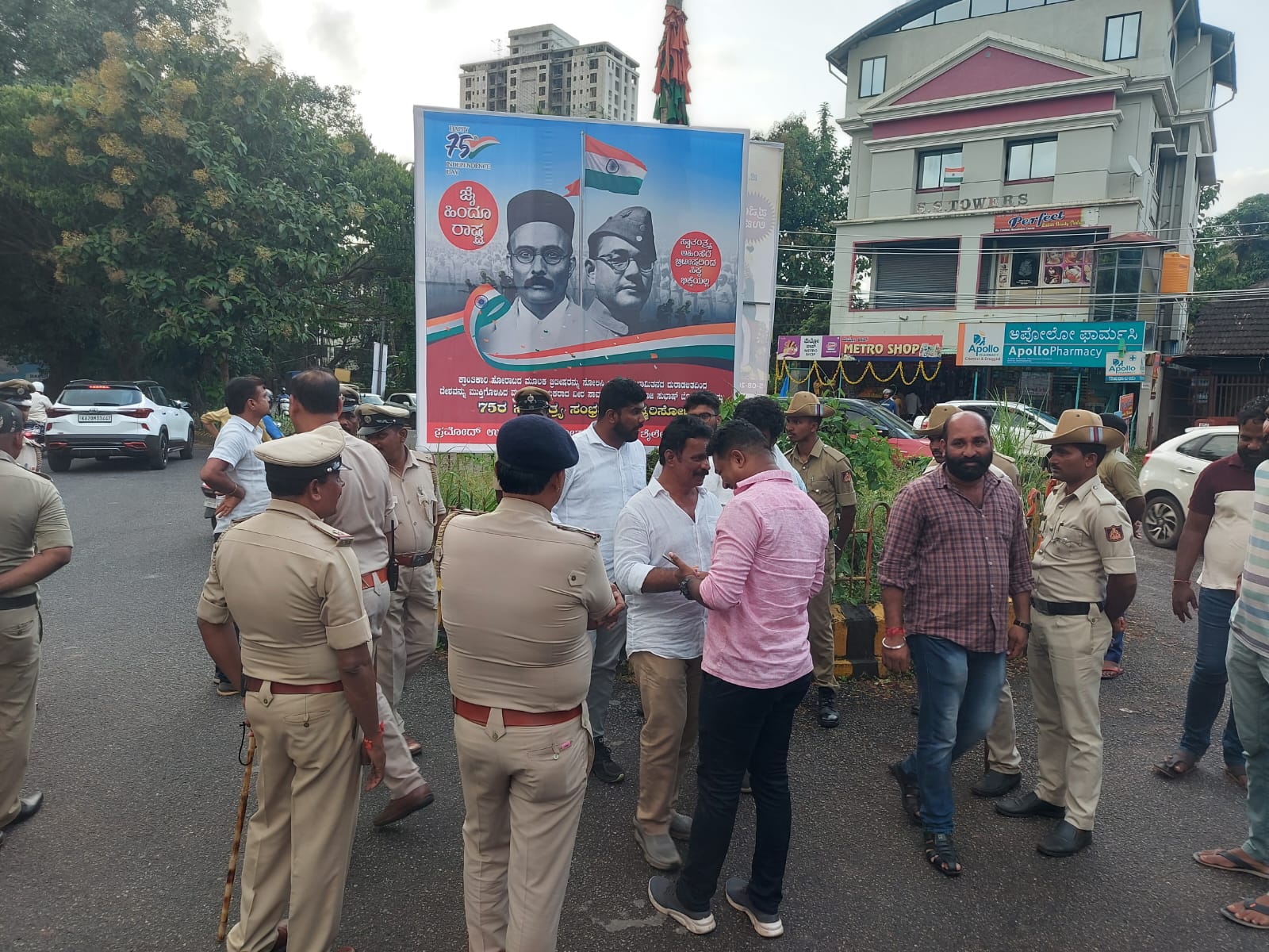 ಕಾಂಗ್ರೆಸ್ ಮುಖಂಡರಾದ ಪ್ರಖ್ಯಾತ್ ಶೆಟ್ಟಿ, ಯತೀಶ್ ಕರ್ಕೇರ ನೇತೃತ್ವದಲ್ಲಿ ಕಾಂಗ್ರೆಸ್ ಕಾರ್ಯಕರ್ತರು ಬ್ರಹ್ಮಗಿರಿ ಸರ್ಕಲ್ಗೆ ಆಗಮಿಸಿ, ವಿವಾದಿತ ಫ್ಲೆಕ್ಸ್ನ್ನು ಕೂಡಲೇ ತೆರವುಗೊಳಿಸಬೇಕು. ಇಲ್ಲದಿದ್ದರೆ ನಾಳೆ ಸರ್ಕಲ್ನಲ್ಲಿ ಪ್ರತಿಭಟನೆ ನಡೆಸಲಾಗುವುದು ಎಂದು ಎಚ್ಚರಿಕೆ ನೀಡಿದರು.