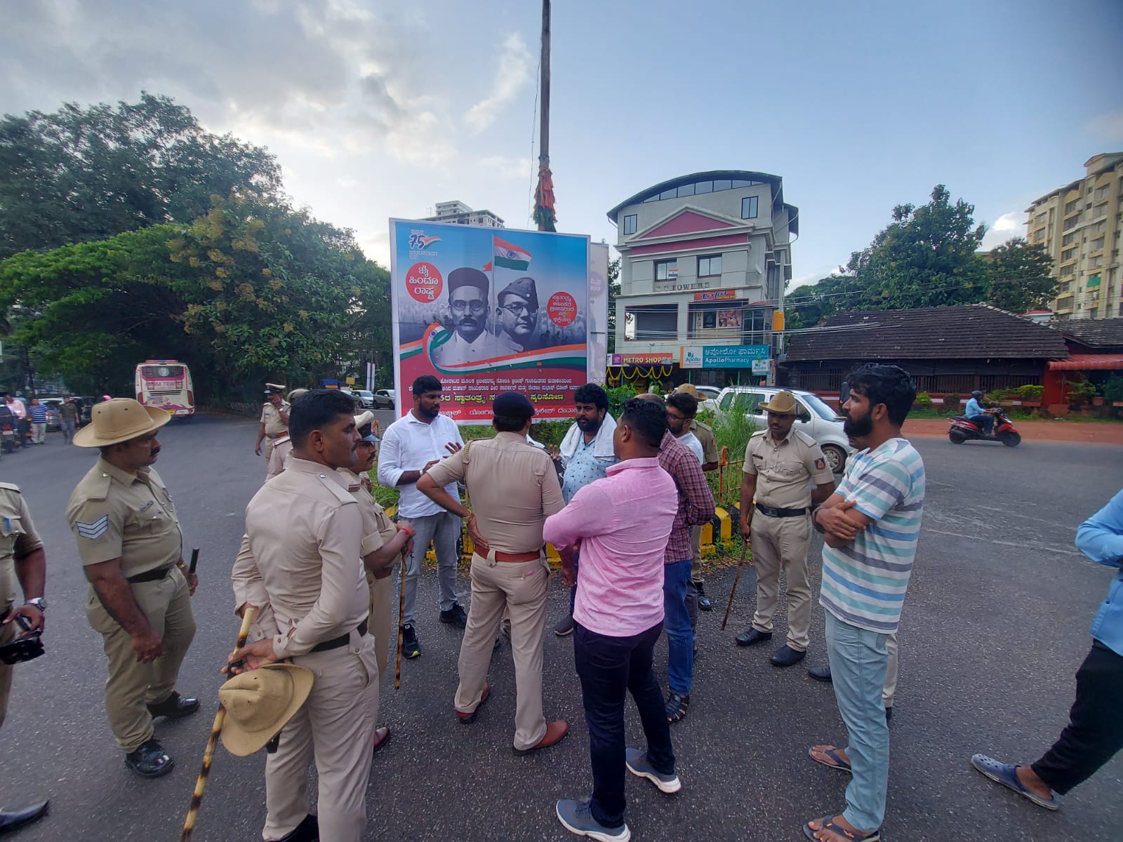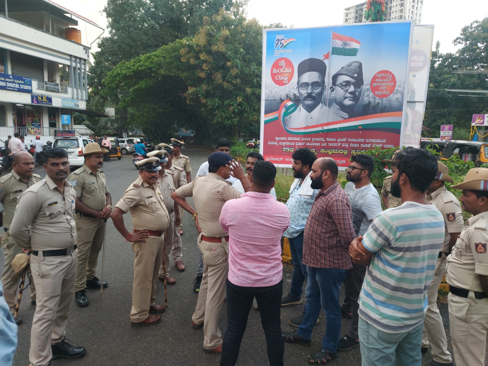 ಉಡುಪಿ: ನಗರದ ಬ್ರಹ್ಮಗಿರಿ ಸರ್ಕಲ್ನಲ್ಲಿ ಸ್ವಾತಂತ್ರ್ಯೋತ್ಸವ ದಿನಾಚರಣೆಗೆ ಶುಭ ಕೋರಲು ಹಾಕಲಾದ ಸಾವರ್ಕರ್ ಭಾವಚಿತ್ರ ಇರುವ ಪ್ಲೆಕ್ಸ್ನ್ನು ಕೂಡಲೇ ತೆರವುಗೊಳಿಸುವಂತೆ ಮಂಗಳವಾರ ಸ್ಥಳದಲ್ಲಿ ಜಮಾಯಿಸಿದ ಕಾಂಗ್ರೆಸ್ ಕಾರ್ಯಕರ್ತರು ಪೊಲೀಸರನ್ನು ಒತ್ತಾಯಿಸಿದರು.