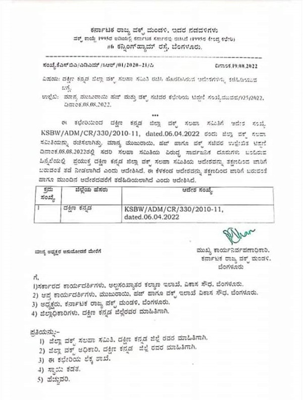 ಈ ಆದೇಶವನ್ನು ದ.ಕ.ಜಿಲ್ಲಾ ವಕ್ಫ್ ಅಧಿಕಾರಿ ಖಚಿತಪಡಿಸಿದ್ದು, ಸಲಹಾ ಸಮಿತಿಯ ಅಧ್ಯಕ್ಷರ ಮಾಹಿತಿಗಾಗಿ ಆದೇಶದ ಪ್ರತಿಯನ್ನು ಕಳಿಸಲಾಗಿದೆ ಎಂದು ತಿಳಿಸಿದ್ದಾರೆ.