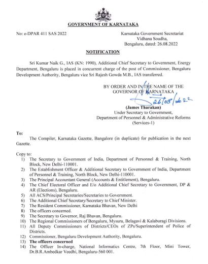ವರ್ಗಾವಣೆ: ಸುಪ್ರೀಂಕೋರ್ಟ್ ಆದೇಶದ ಹಿನ್ನೆಲೆಯಲ್ಲಿ ರಾಜ್ಯ ಸರಕಾರವು ಬಿಡಿಎ ಆಯುಕ್ತ ಎಂ.ಬಿ.ರಾಜೇಶ್ ಗೌಡ ಅವರನ್ನು ವರ್ಗಾವಣೆ ಮಾಡಿದ್ದು, ಅವರ ಸ್ಥಾನದ ಹೆಚ್ಚುವರಿ ಹೊಣೆಗಾರಿಕೆಯನ್ನು ಇಂಧನ ಇಲಾಖೆಯ ಹೆಚ್ಚುವರಿ ಮುಖ್ಯ ಕಾರ್ಯದರ್ಶಿ ಜಿ.ಕುಮಾರ್ ನಾಯ್ಕ್ ಅವರಿಗೆ ವಹಿಸಲಾಗಿದೆ.