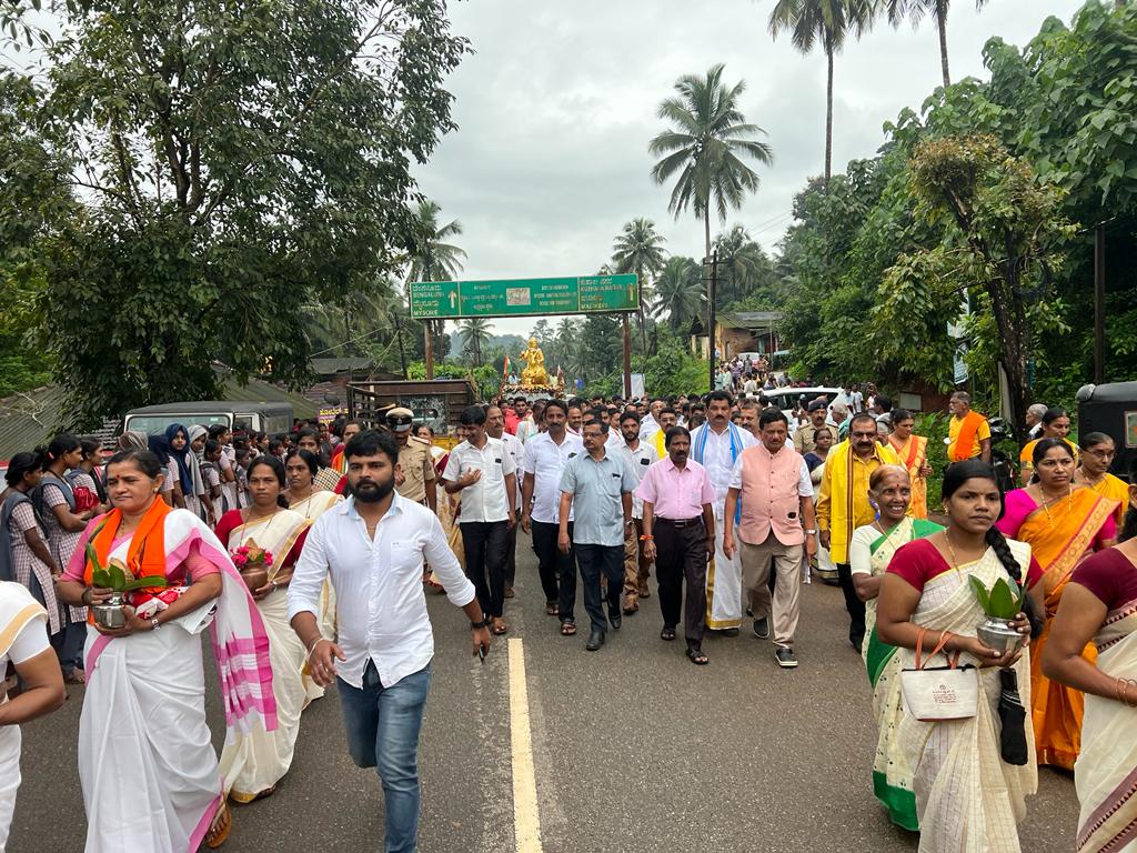 ಬಳಿಕ ಅರಂತೋಡು, ಪೆರಾಜೆಯಲ್ಲಿ ಪುಷ್ಪಾರ್ಚನೆ ಮಾಡಿ ಪ್ರತಿಮೆಯನ್ನು ಸ್ವಾಗತಿಸಲಾಯಿತು. ಆಂಧ್ರ ಪ್ರದೇಶದ ವಿಜಯವಾಡದಲ್ಲಿ ಕಂಚಿನ ಪ್ರತಿಮೆ ತಯಾರಾಗಿ ಅಲ್ಲಿಂದ ಹೊರಟ ಮೆರವಣಿಗೆ, ಆದಿಚುಂಚನಗಿರಿ ಮಠ, ಕೊಡಗಿನ ವಿವಿಧ ಭಾಗಗಳಲ್ಲಿ ನಡೆದ ಅದ್ದೂರಿ ಸ್ವಾಗತವನ್ನು ಸ್ವೀಕರಿಸಿ ದಕ್ಷಿಣ ಕನ್ನಡ ಜಿಲ್ಲೆಗೆ ಆಗಮಿಸಿತು.