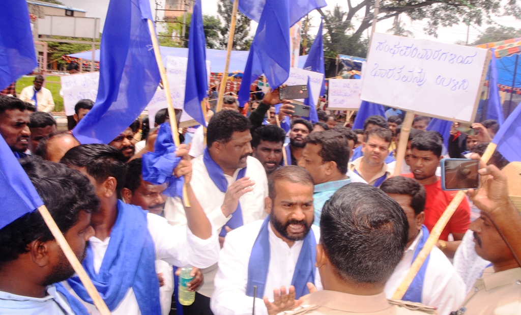 ಧರಣಿ ಸಂದರ್ಭದಲ್ಲಿ ಪೊಲೀಸ್ ಇಲಾಖೆ ಅಧಿಕಾರಿ, ಸಿಬ್ಬಂದಿ ಪ್ರತಿಭಟನೆಗೆ ಅಡ್ಡಿಪಡಿಸಿದ್ದಾರೆ ಎಂದು ಮುಖಂಡರು ಆರೋಪಿಸಿ, ಸ್ಥಳದಲ್ಲಿದ್ದ ಪೊಲೀಸ್ ಇಲಾಖೆ ಸಿಬ್ಬಂದಿಯನ್ನು ತರಾಟೆಗೆ ಪಡೆದರು. ಈ ವೇಳೆ ಪೊಲೀಸರು ಹಾಗೂ ಸಂಘಟನೆಗಳ ಮುಖಂಡರ ನಡುವೆ ಮಾತಿನ ಚಕಮಕಿ ನಡೆಯಿತು. ವಿವಿಧ ಸಂಘಟನೆಗಳ ಮುಖಂಡರಾದ ಭರತ್, ಹೊನ್ನೇಶ್, ಚದಂಬರ್, ಹುಣಸೇಮಕ್ಕಿ ಲಕ್ಷ್ಮಣ್, ಮರ್ಲೆ ಅಣ್ಣಯ್ಯ, ಗೌಸ್ಮುನೀರ್, ಬಸವರಾಜು, ಮೋಹನ್ ಕಬ್ಬಿಗೆರೆ, ಉಮೇಶ್ ಸೇರಿದಂತೆ ಮತ್ತಿತರ ಮುಖಂಡರು, ಕಾರ್ಯಕರ್ತರು ಧರಣಿಯಲ್ಲಿ ಉಪಸ್ಥಿತರಿದ್ದರು.