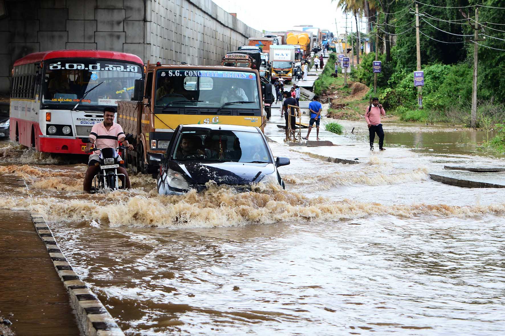 ಬೆಂಗಳೂರು-ಮೈಸೂರು ಹೆದ್ದಾರಿ ಮಧ್ಯೆ ಪ್ರವಾಹದ ನೀರಿನಲ್ಲಿ ಸಿಲುಕಿದ ಕಾರು