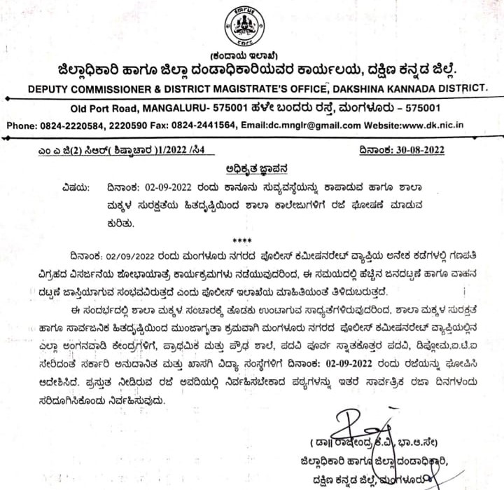 ಮಂಗಳೂರು, ಆ.30: ಪೊಲೀಸ್ ಕಮಿಷನರೇಟ್ ವ್ಯಾಪ್ತಿಯ ಮಂಗಳೂರು ನಗರದ ಶಾಲಾ-ಕಾಲೇಜುಗಳಿಗೆ ಸೆ. 2ರಂದು ರಜೆ ಘೋಷಣೆ ಮಾಡಿ ದಕ್ಷಿಣ ಕನ್ನಡ ಜಿಲ್ಲಾಧಿಕಾರಿ ಡಾ. ಕೆ.ವಿ. ರಾಜೇಂದ್ರ ಆದೇಶ ಹೊರಡಿಸಿದ್ದಾರೆ.