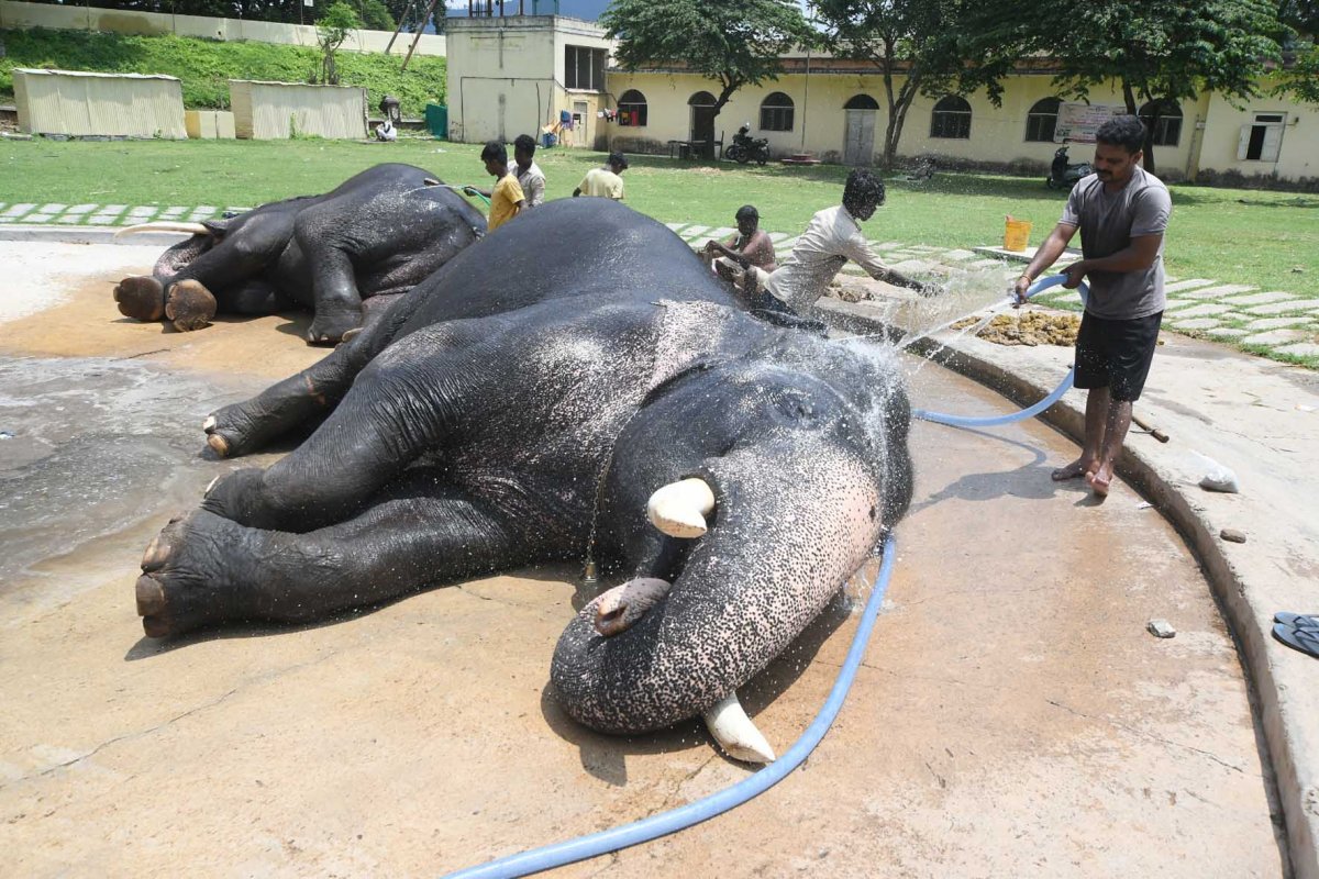 ಆನೆಗಳಿಗೆ ಸ್ನಾನ ಮಾಡಿಸುತ್ತಿರುವ ಮಾವುತ