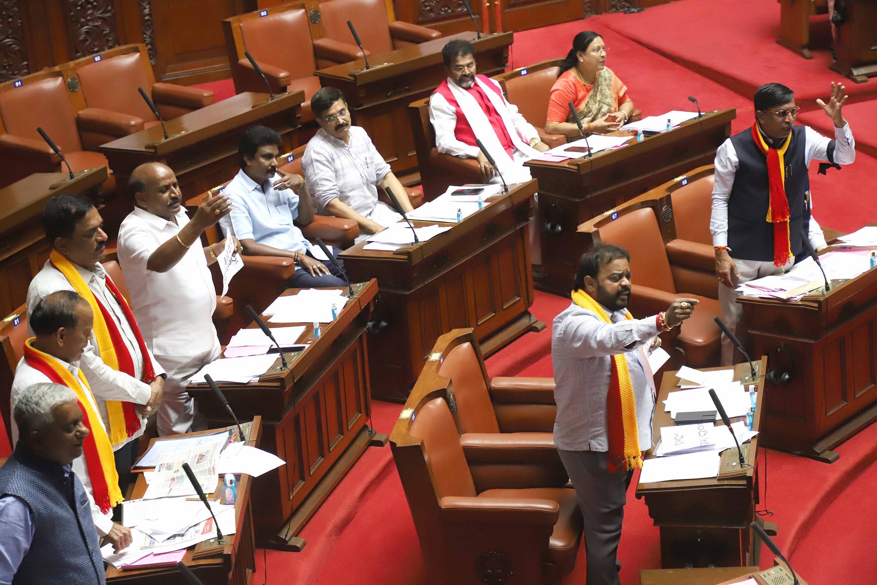 ಬೆಂಗಳೂರು, ಸೆ. 14: ‘ಹಿಂದಿ ದಿವಸ್' ಆಚರಣೆ ಮಾಡುವುದಕ್ಕೆ ತೀವ್ರ ಆಕ್ಷೇಪ ವ್ಯಕ್ತಪಡಿಸಿದ ಜೆಡಿಎಸ್ ಸದಸ್ಯರು, ಕನ್ನಡ ಶಾಲು ಧರಿಸಿ ವಿಧಾನಸಭೆ ಕಲಾಪದಲ್ಲಿ ಹಾಜರಾಗಿದ್ದಲ್ಲದೆ, ‘ಕನ್ನಡ ಭಾಷೆಗೆ ಅನ್ಯಾಯ ಆಗುವುದನ್ನು ಯಾವುದೇ ಕಾರಣಕ್ಕೂ ಸಹಿಸಲು ಸಾಧ್ಯವಿಲ್ಲ' ಎಂದು ಆಕ್ರೋಶ ವ್ಯಕ್ತಪಡಿಸಿದರು.