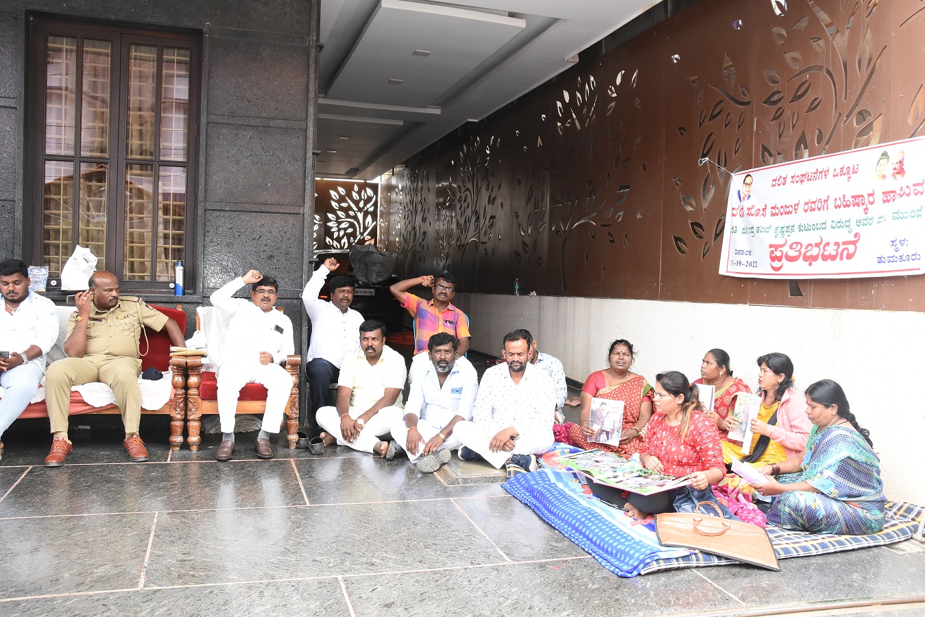 ತುಮಕೂರು | ದಲಿತ ಸೊಸೆಯನ್ನು ಮನೆಗೆ ಸೇರಿಸದ ಕುಟುಂಬ: ಮಗುವಿನೊಂದಿಗೆ ಧರಣಿ ಕುಳಿತ ಮಹಿಳೆ