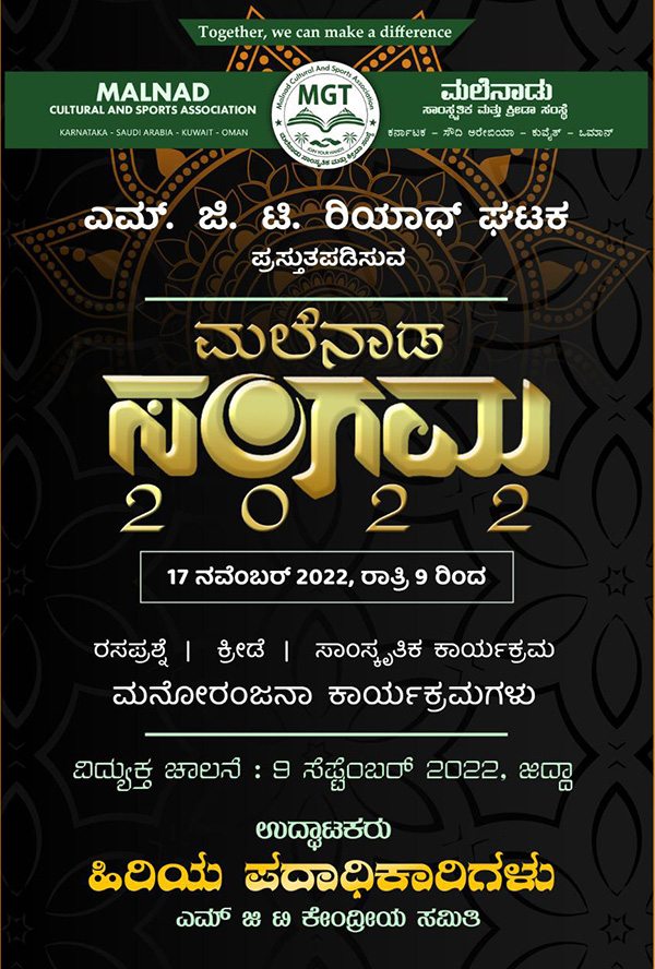 ಎಂ.ಜಿ.ಟಿ. ರಿಯಾದ್ ಘಟಕ ಪ್ರಸ್ತುತಪಡಿಸುವ "ಮಲೆನಾಡ ಸಂಗಮ-2022"ದಲ್ಲಿ ರಸಪ್ರಶ್ನೆ, ಕ್ರೀಡೆ, ಸಾಂಸ್ಕೃತಿಕ ಕಾರ್ಯಕ್ರಮ, ಮನೋರಂಜನಾ ಕಾರ್ಯಕ್ರಮಗಳು ನಡೆಯಲಿವೆ.