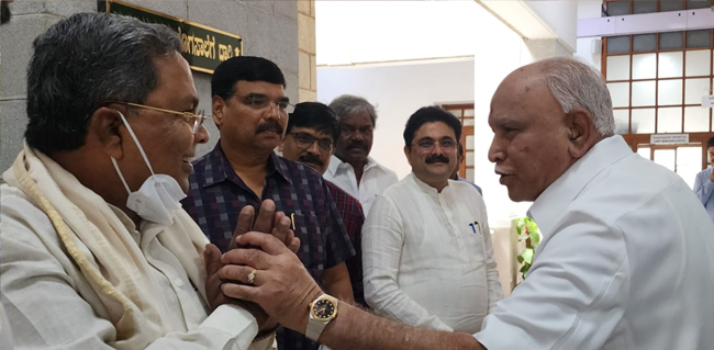 ಬೆಂಗಳೂರು, ಸೆ. 22: ಸದಾ ಆರೋಪ-ಪ್ರತ್ಯಾರೋಪ ಮಾಡಿಕೊಳ್ಳುತ್ತಾ ಬದ್ಧ ವೈರಿಗಳಂತೆ ಕಾಣುವ ಪ್ರತಿಪಕ್ಷ ನಾಯಕ ಸಿದ್ದರಾಮಯ್ಯ ಹಾಗೂ ಮಾಜಿ ಮುಖ್ಯಮಂತ್ರಿ ಬಿ.ಎಸ್.ಯಡಿಯೂರಪ್ಪನವರು ಪರಸ್ಪರ ಉಭಯ ಕುಶಲೋಪರಿ ವಿಚಾರಿಸಿ ಕೈಕುಲುಕಿ, ಹಾಸ್ಯ ಮಾಡಿದ್ದು ವಿಧಾನಸಭೆಯ ಮೊಗಸಾಲೆಯಲ್ಲಿ ನಡೆಯಿತು.