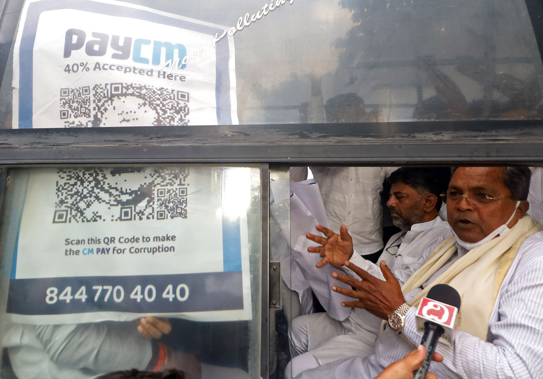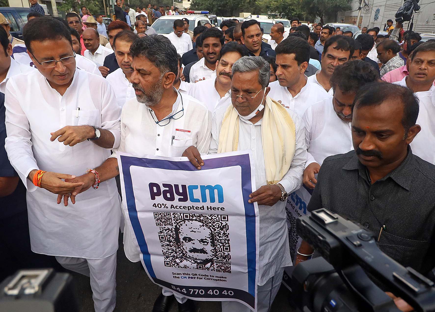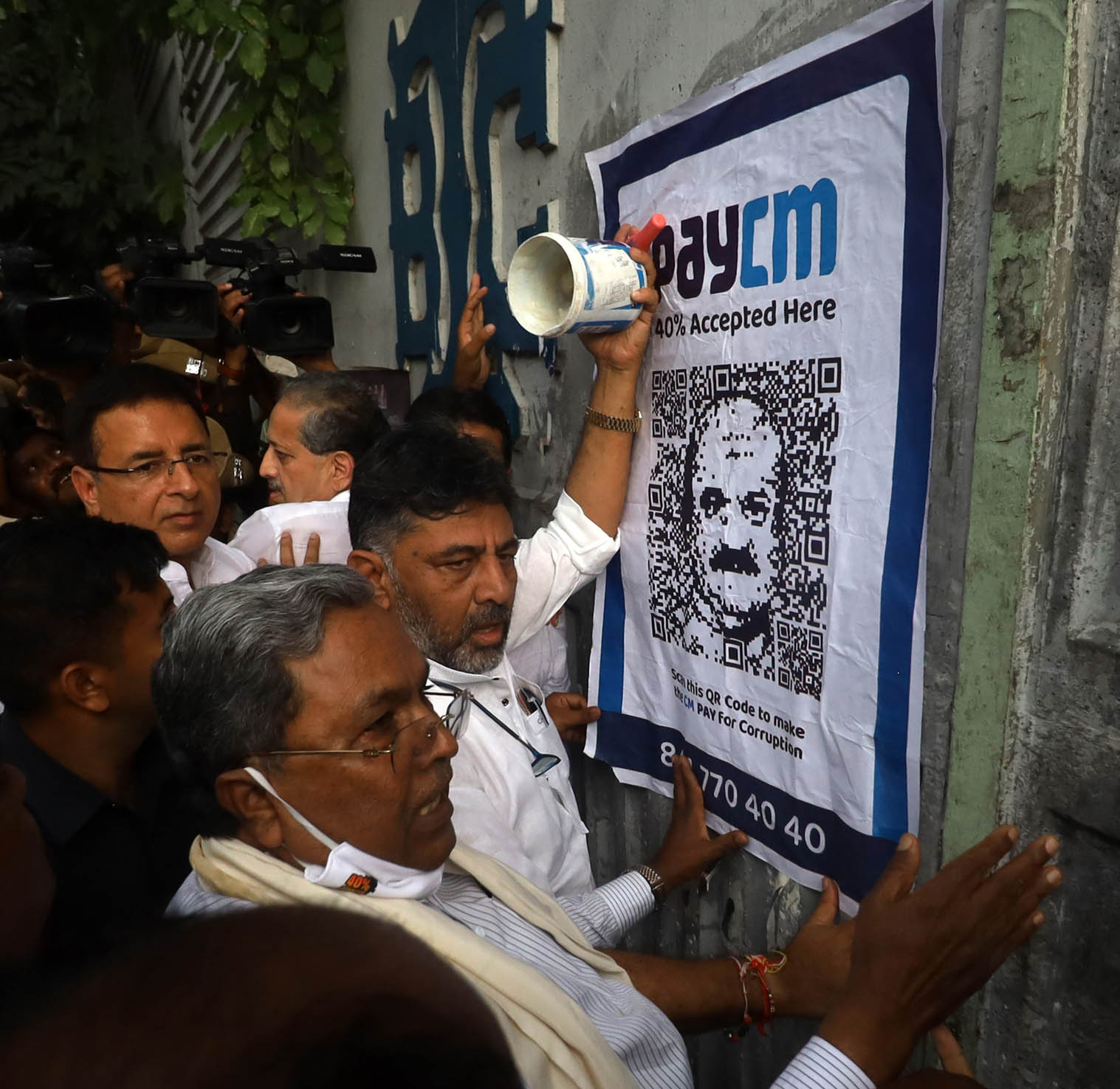 ಶುಕ್ರವಾರ ಇಲ್ಲಿನ ರೇಸ್‍ಕೋರ್ಸ್ ರಸ್ತೆಯಲ್ಲಿ ಜಮಾಯಿಸಿದ ವಿಧಾನಸಭೆಯ ವಿರೋಧ ಪಕ್ಷದ ನಾಯಕ ಸಿದ್ದರಾಮಯ್ಯ, ಪರಿಷತ್ತಿನ ವಿಪಕ್ಷ ನಾಯಕ ಬಿ.ಕೆ.ಹರಿಪ್ರಸಾದ್, ಎಐಸಿಸಿ ಪ್ರಧಾನ ಕಾರ್ಯದರ್ಶಿ ರಣದೀಪಸಿಂಗ್ ಸುರ್ಜೆವಾಲ, ಕೆಪಿಸಿಸಿ ಅಧ್ಯಕ್ಷ ಡಿ.ಕೆ.ಶಿವಕುಮಾರ್, ಪ್ರಚಾರ ಸಮಿತಿ ಅಧ್ಯಕ್ಷ ಎಂ.ಬಿ.ಪಾಟೀಲ್, ಕಾರ್ಯಾಧ್ಯಕ್ಷ ಸಲೀಂ ಅಹ್ಮದ್, ಶಾಸಕರಾದ ಪ್ರಿಯಾಂಕ್ ಖರ್ಗೆ ಸೇರಿದಂತೆ ಹಲವು ನಾಯಕರು ‘ಪೇ ಸಿಎಂ’ ಕ್ಯೂಆರ್ ಕೋಡ್ ಪೋಸ್ಟರ್ ಅಂಟಿಸಿದರು.
