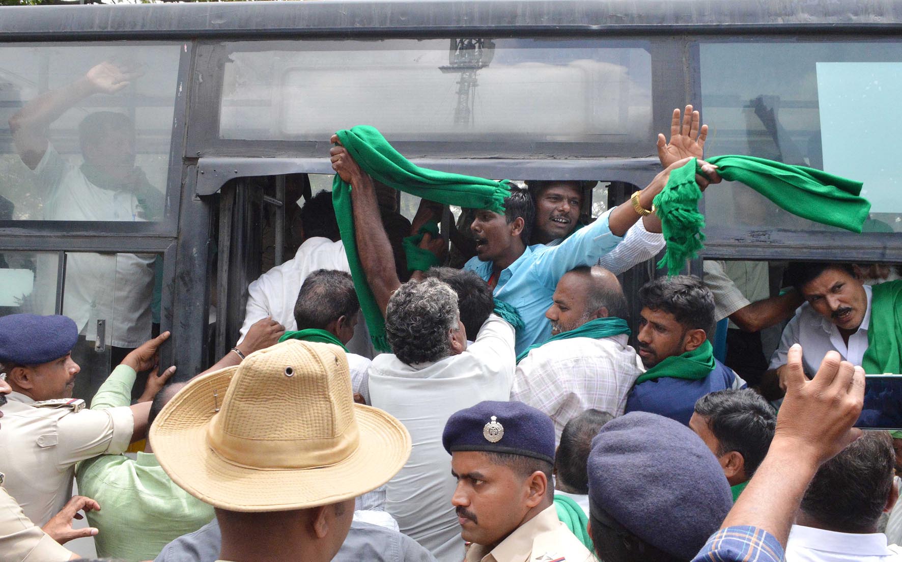 ಈ ವೇಳೆ ಮಧ್ಯಪ್ರವೇಶಿಸಿದ ಪೊಲೀಸರು ರೈತ ನಾಯಕರಾದ ಜಗಜೀತಸಿಂಗ್ ದಲ್ಲೇವಾಲ, ಶಿವಕುಮಾರ, ದೈವಸಿಗಾಮಣಿ, ಕೆ.ವಿ.ಬಿಜು, ಅಭಿಮನ್ಯುಕೊಹಾರ ಸೇರಿದಂತೆ ನೂರಾರು ರೈತರನ್ನು ಬಂಧಿಸಿ ವಾಹನದಲ್ಲಿ ಕರೆದೊಯ್ದರು.