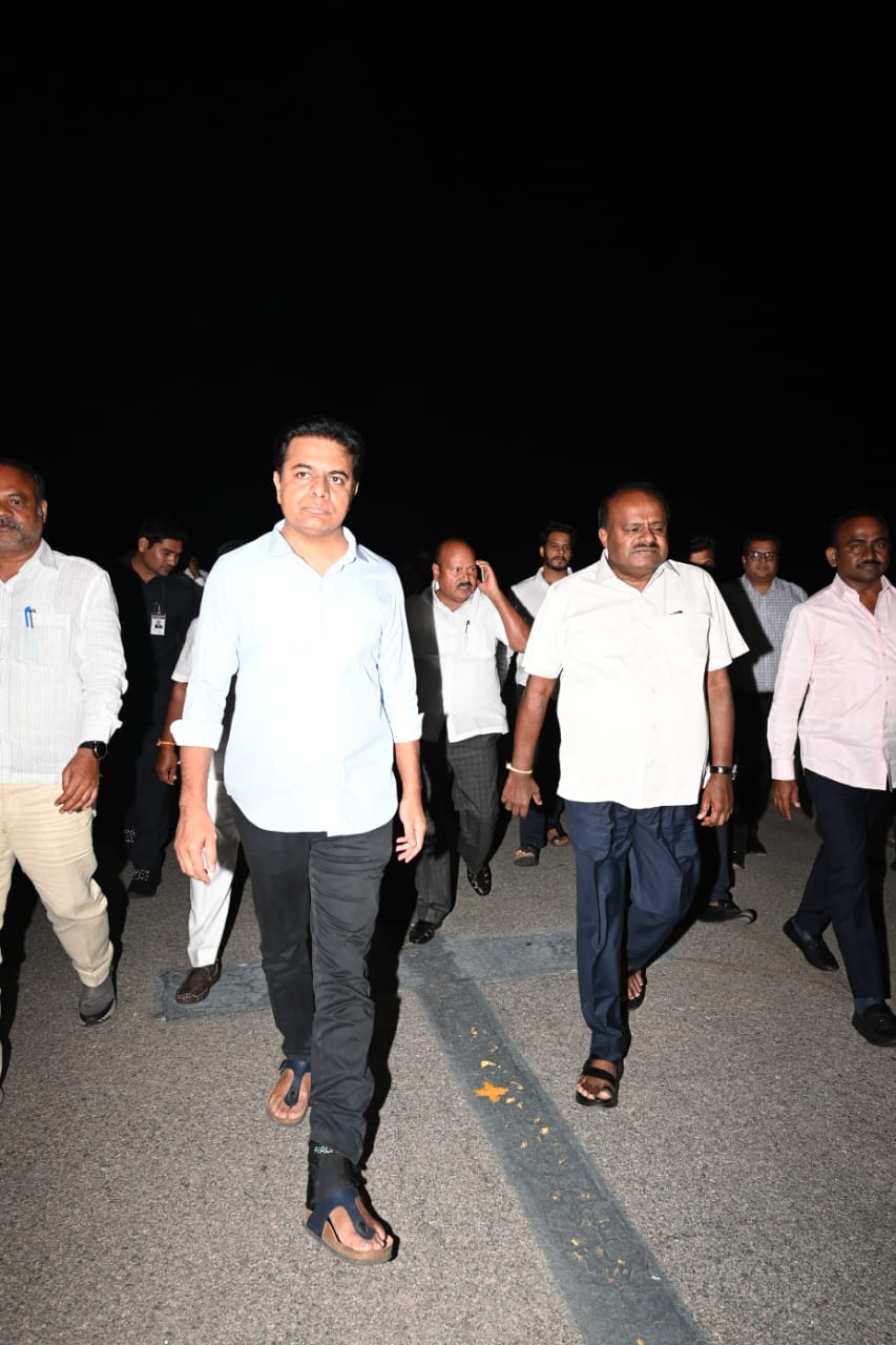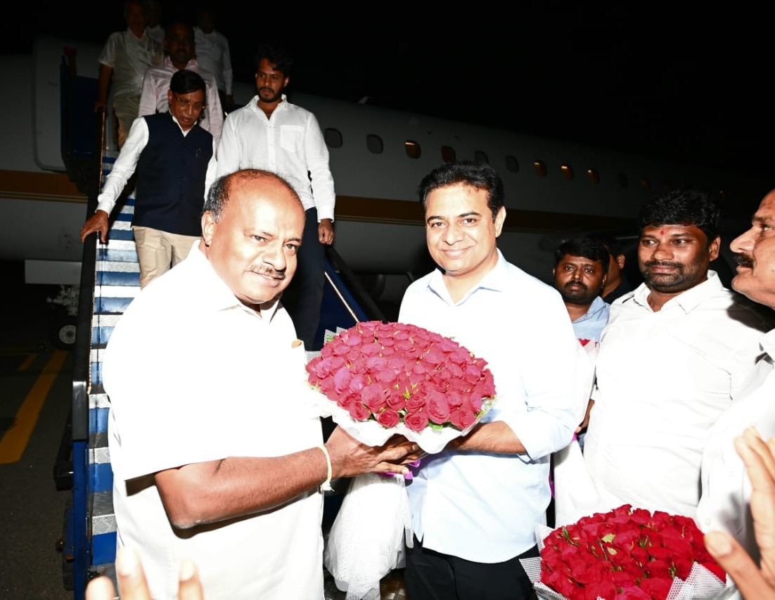 JD(S) leader and former Karnataka HD Kumaraswamy along with his MLAs arrives in Hyderabad ahead of the launch of a national party by Telangana CM KC Rao tomorrow. They were received by TRS leader & Telangana minister KT Rama Rao.